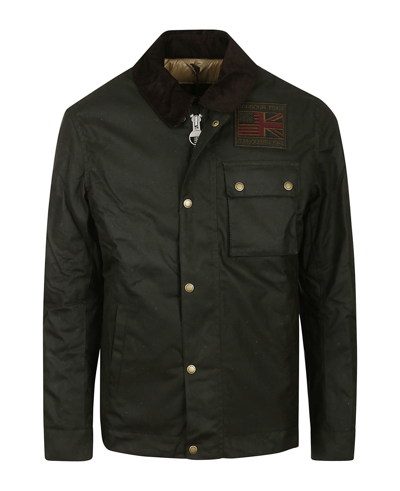 `Green waxed cotton Barbour jacket, with zip and button closure, brown velvet collar, chest pocket, side pockets, front patch insert. `