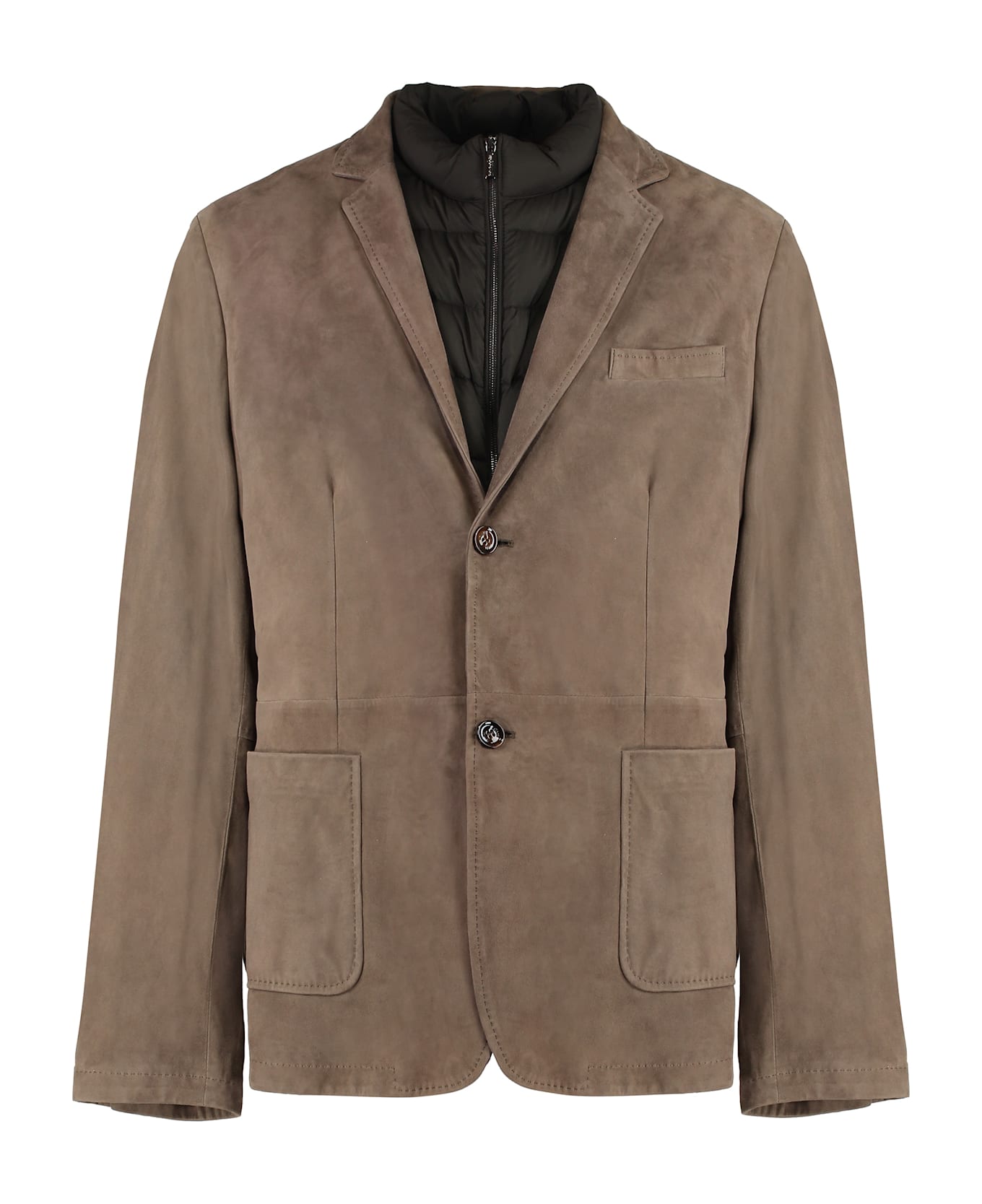 Removable inner waistcoat lapel collar two front pockets and chest pocket buttoned cuffs back slit hem padding: 100% goose down 100% leather, 5% polyurethane, 95% polyamide Composition: 100% % Leather, 5% % Polyurethane, 95% % Polyamide