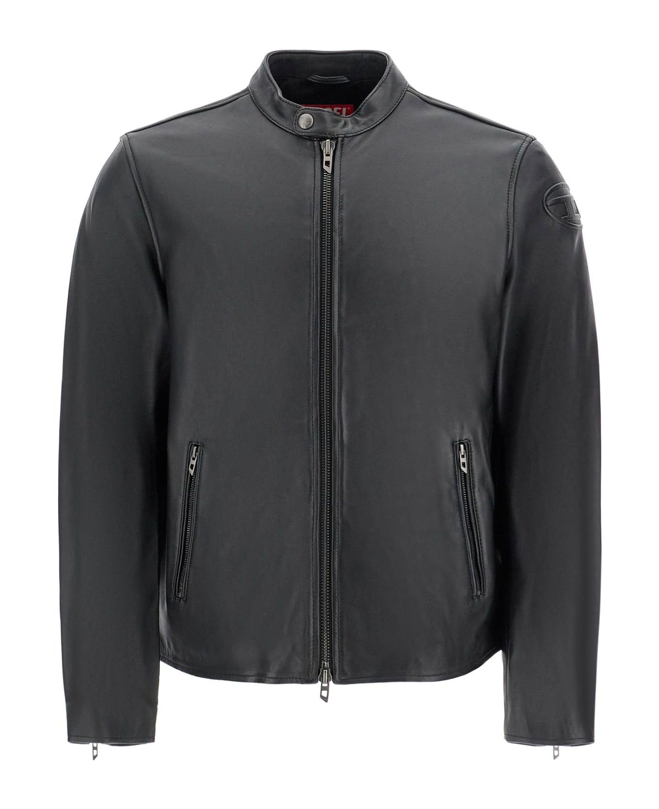 The Diesel biker jacket is made of soft, natural used leather with a slightly boxy cut and bold raised Oval D logo on the left sleeve. It features a snap button collar, two-way zip closure, front zip pockets, and zip openings on the cuffs. Lined in fabric with one pocket. The model is 187 cm tall and wears size IT 50.