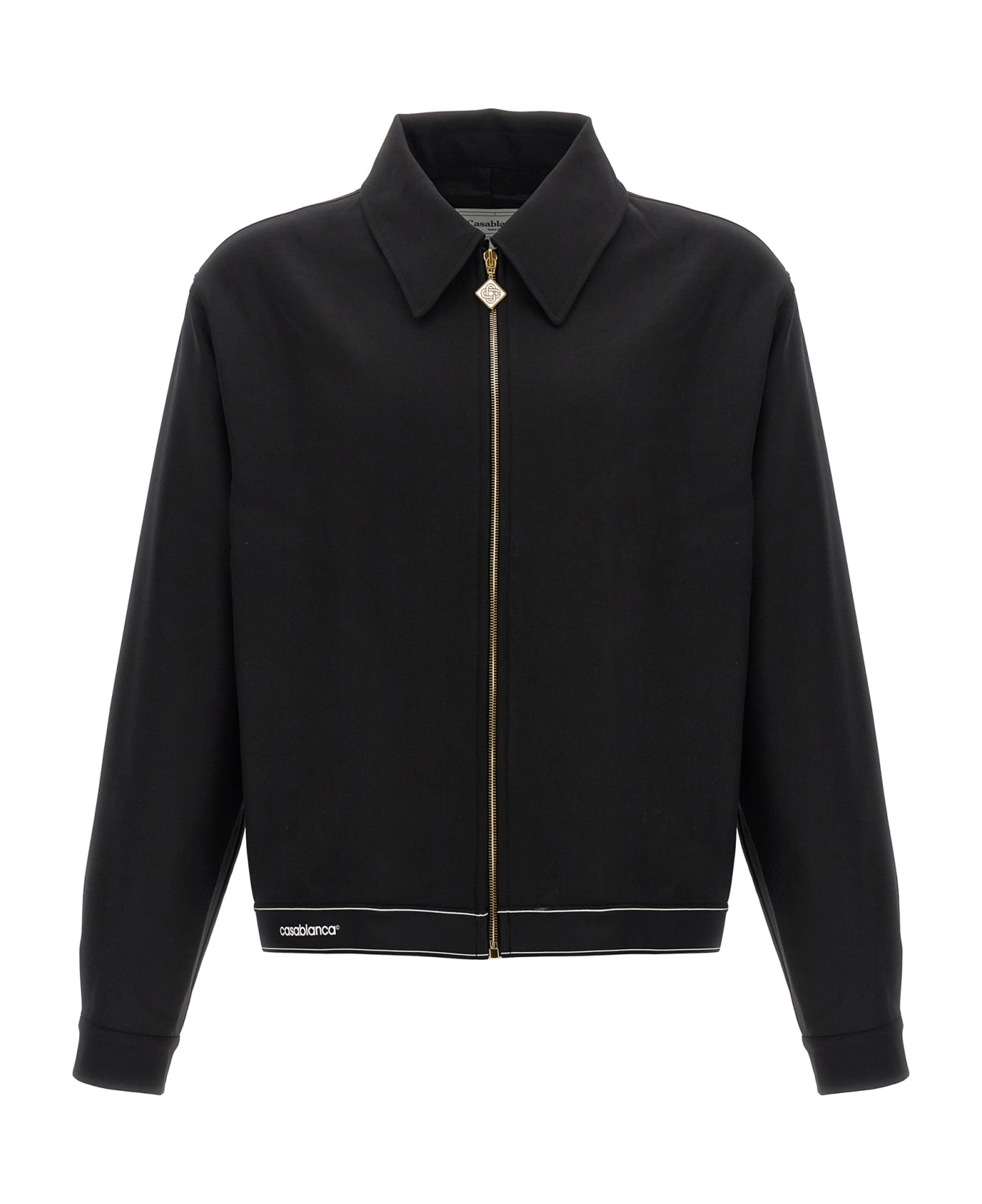 Casablanca logo tech jacket in black virgin wool and fabric with classic collar, zip closure, Diamond logo zipper detail, buttons on the cuffs, contrasting logo embroidery on the front, two side welt pockets, and straight hem. Composition: 53% Polyester, 43% Virgin Wool, 4% Elastane