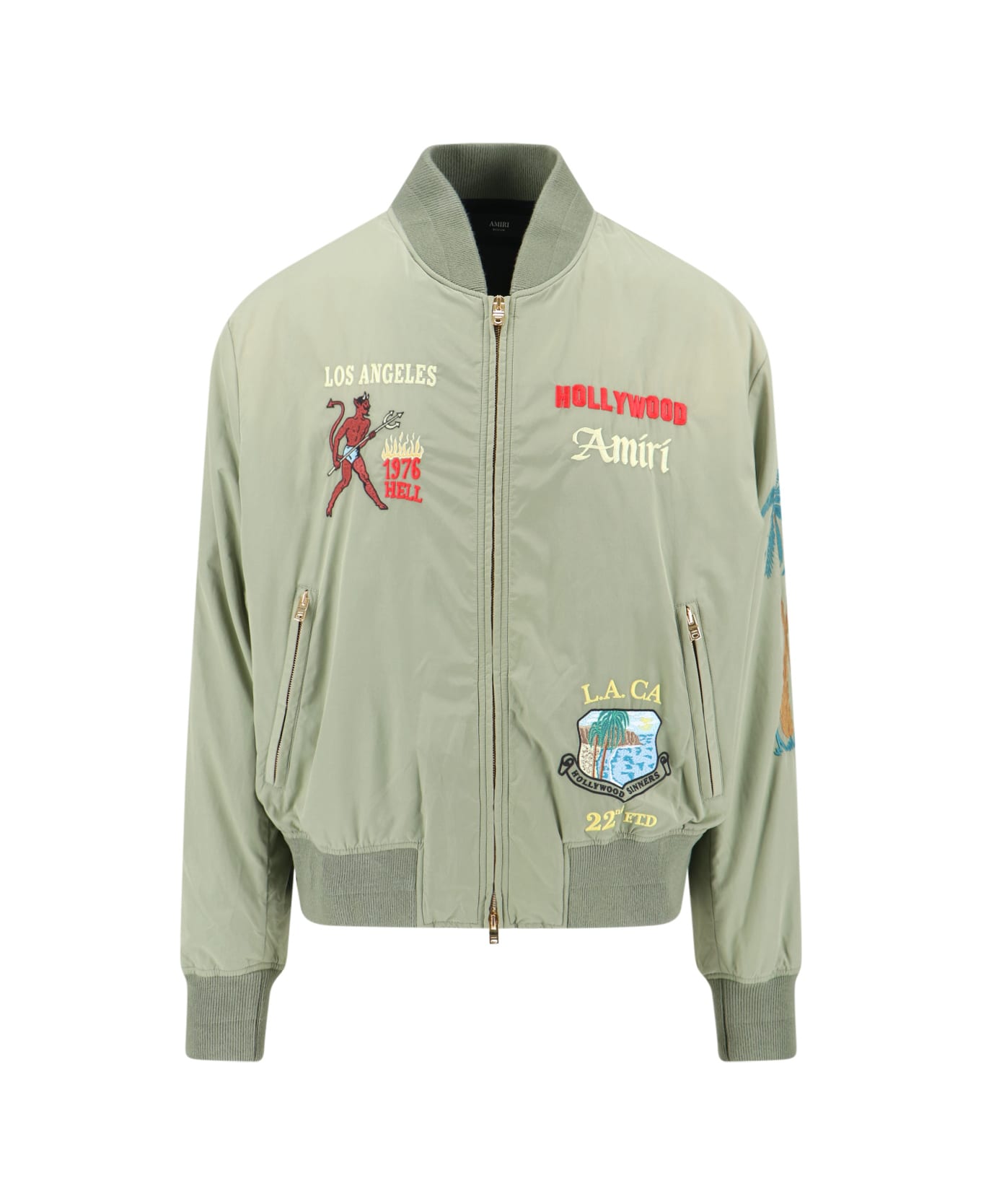 Amiri 'Sinners' green cotton blend bomber jacket with shawl collar, ribbed trims, zip closure, all-over multicolor logo embroidery, two side zip pockets, elasticated cuffs and waist, straight hem. Composition: 54% Polyamide, 46% Cotton