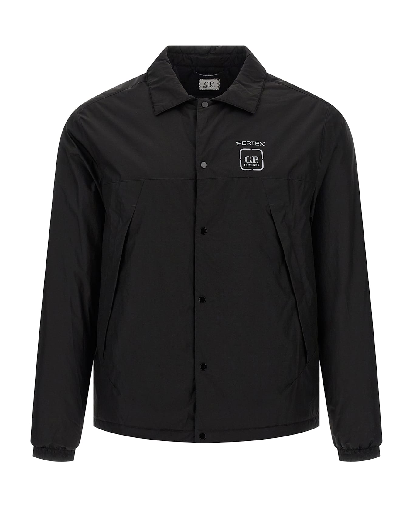 'The Metropolis Series' overshirt in ripstop fabric produced by Pertex® lightly padded with water-repellent goose down, front and back print, collar, front snap button closure, pockets, long sleeves with elastic cuffs, drawstring at the hem.