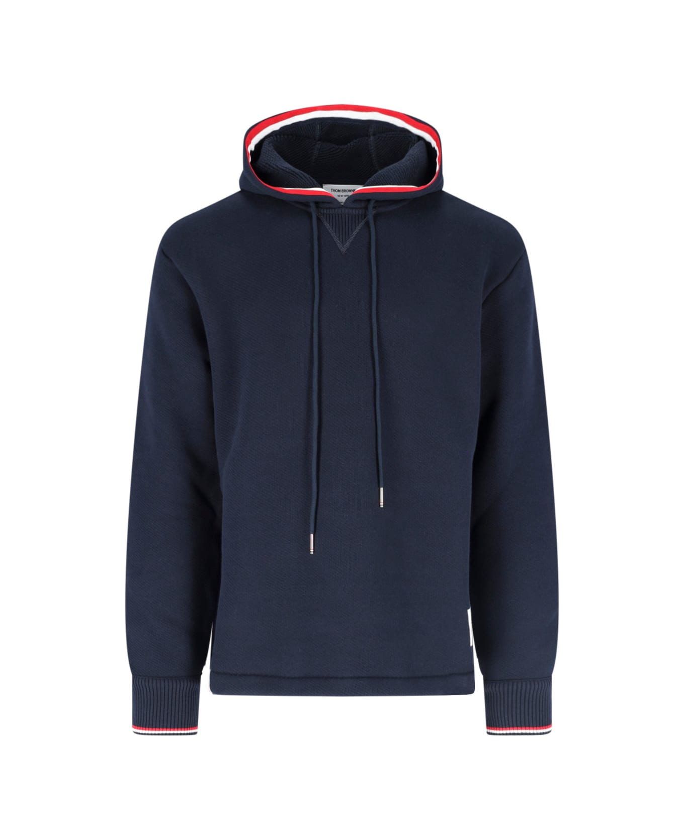 Thom Browne RWB striped sweatshirt in navy blue cotton with maxi hood with white, red and blue details, drawstring detail, logo label on the front, side slits with buttoned white, red and blue details, ribbed trim, and straight hem. Composition: 92% Cotton, 8% Polyamide