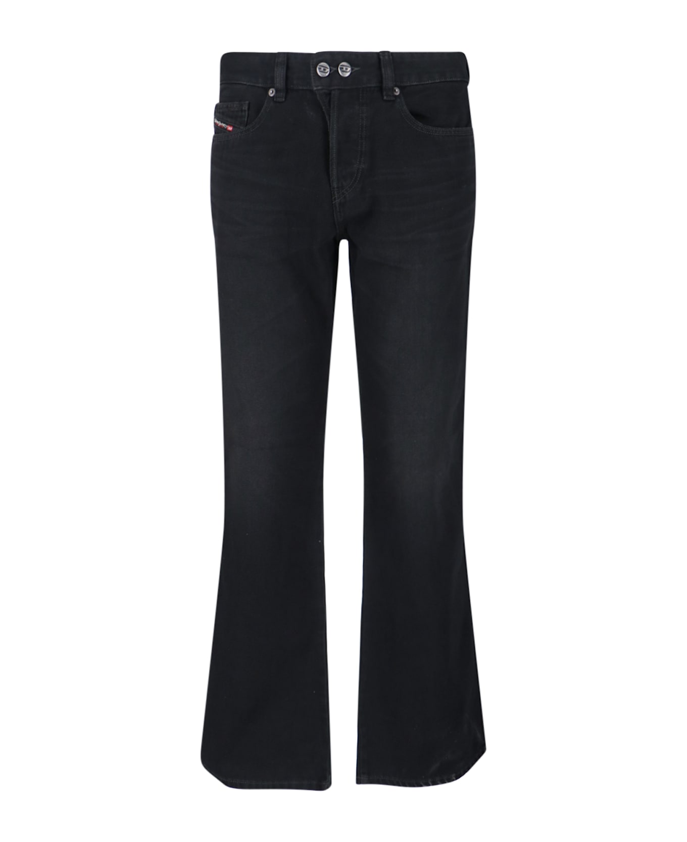 Diesel '1998 d-buck' bootcut jeans in black denim with distressed wash, mid waist, belt loops, button closure, five-pocket design, back logo patch, flared leg. Composition: 100% Cotton