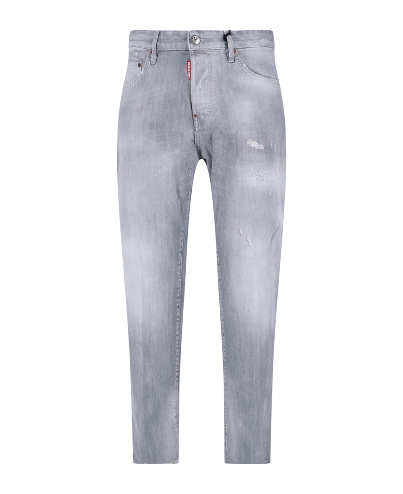 642 jean dsquared2 light toned gray stretch cotton jeans with mid waist, front button closure, front logo tag, back logo patch, destroyed details, straight leg. Composition: 98% Cotton, 2% Elastane