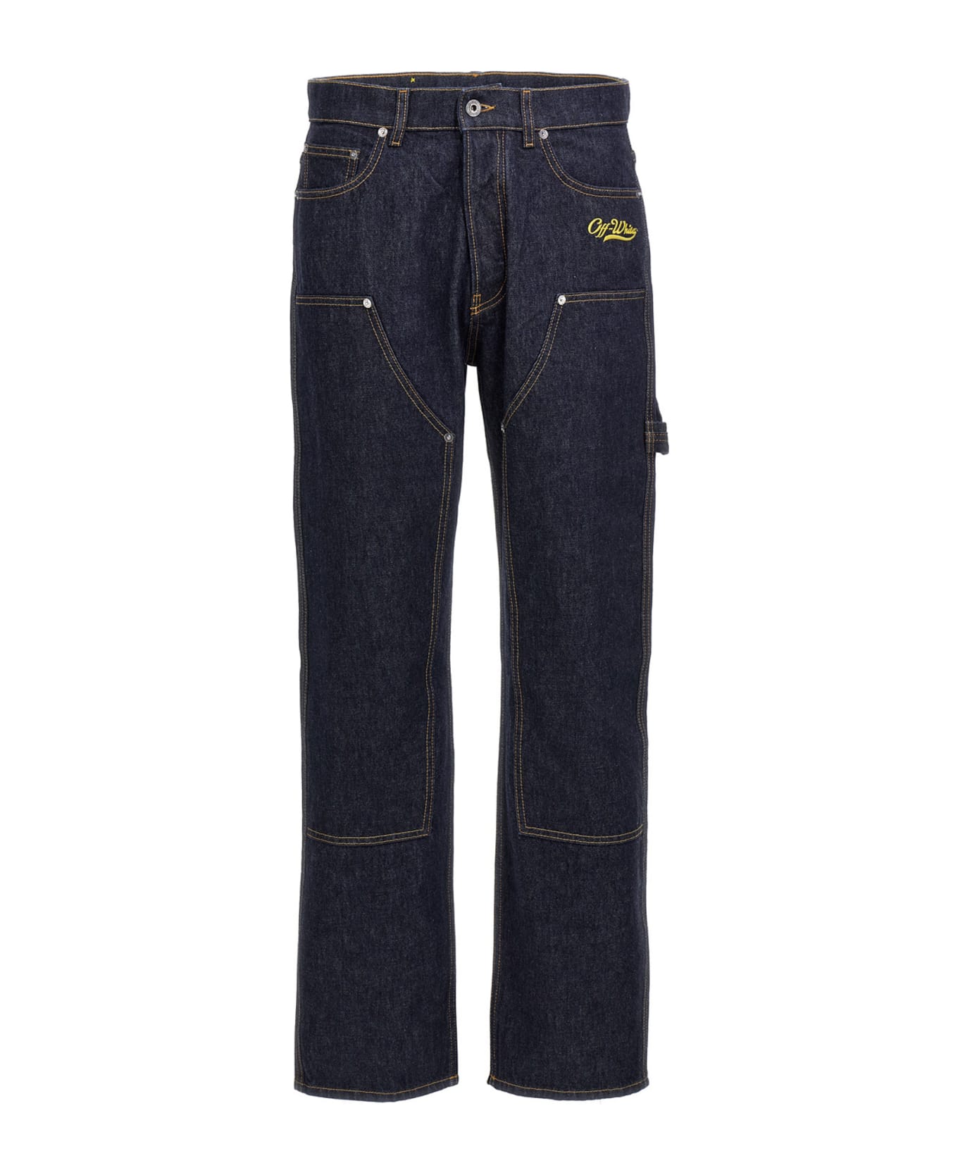 Jeans in denim modello carpenter, gamba ampia, ricamo logo frontale e chiusura bottoni.