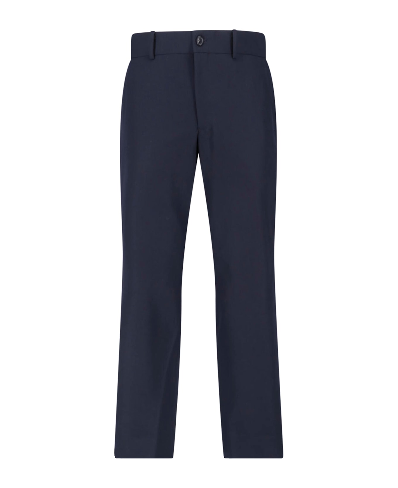 - Straight blue wool pants Comme Des Garçons - mid-rise - button and zip closure - belt loops - two side pockets - two back pockets - straight leg
