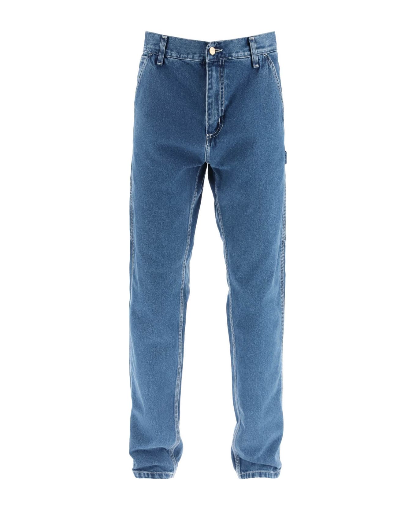 Carhartt jeans made of stone washed denim with a tapered mid-rise cut and a regular fit. Workwear-inspired design with contrasting reinforced seams, tool pockets and hammer loop. Belt loops, zip fly with button, logo label on the back pocket. The model is 187 cm tall and wears a size 30. Composition: 100%CO