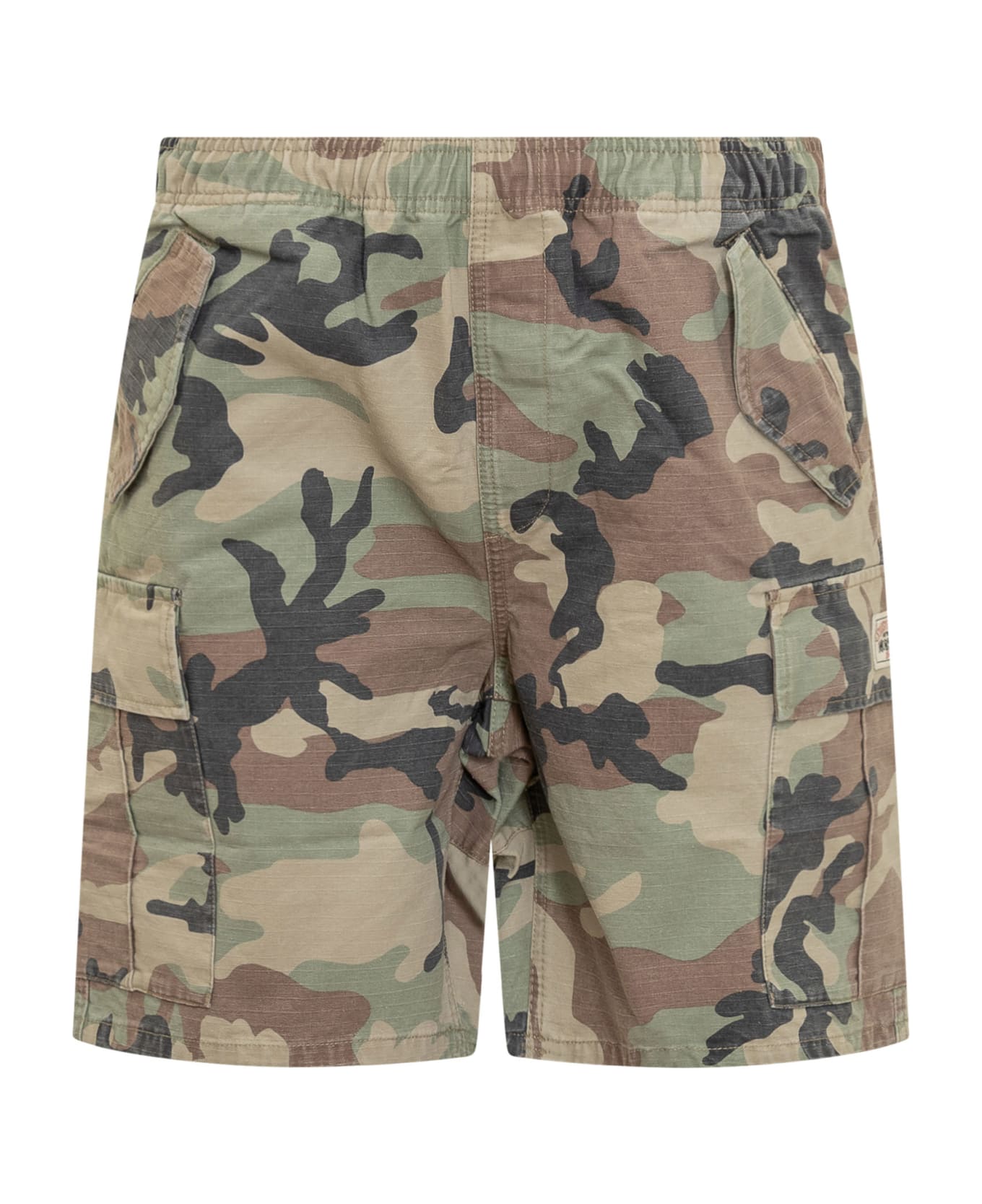 Camouflage Bermuda shorts. Elastic and drawstring waist. Side and back pockets. Side logo.