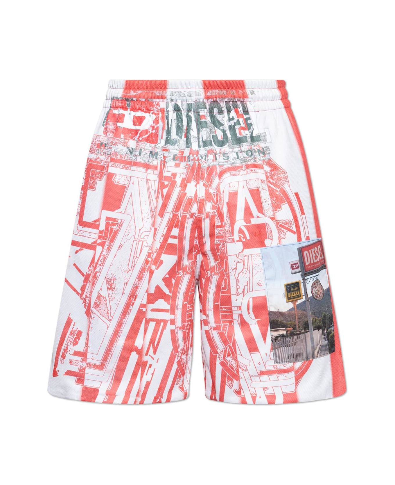 The P-KURT shorts by Diesel epitomize contemporary sophistication and urban edge. Rendered in a bold red hue, these shorts are accentuated with striking white graphic lines and typographic details that envelop the entirety of the design. Crafted from a breathable, textured mesh fabric favored in luxury sportswear, their relaxed silhouette extends comfortably to the knee, offering a blend of ease and elevated style. Standout features include a prominent DIESEL logo emblazoned on the elastic waistband, a generously sized patch pocket adorned with a billboard-style logo print and a secondary branded label, as well as a discreet monochromatic back pocket for refined utility. Every element speaks to Diesel's heritage of innovative Italian craftsmanship and fashion-forward design. Why choose this product? Exclusive graphic design and iconic branding Premium breathable mesh fabric for all-day comfort Functional and stylish pocket details Signature Diesel Italian craftsmanship Distinctive addition to any luxury casual wardrobe