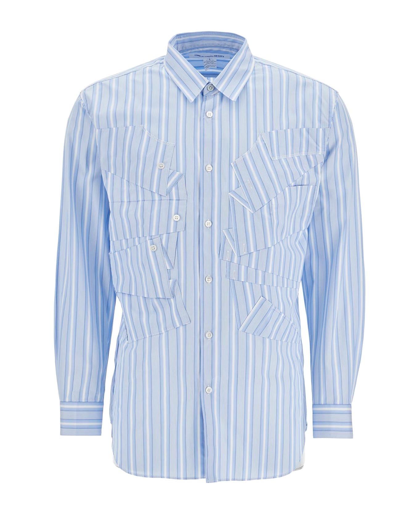 This Comme des Garçons SHIRT shirt is made of striped cotton poplin and features a classic cut. It is decorated with appliqué inserts on the front that resemble fabric scraps. The fit is regular. The model is 182 cm tall and wears size L.