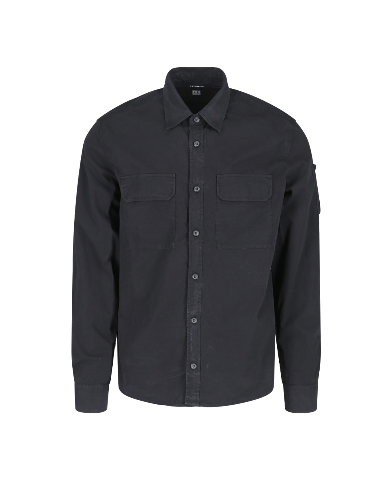 C. P. Company logo shirt jacket in black cotton with classic collar, button closure, two maxi front pockets, logo patch sleeve, button cuffs, curved hem. Composition: 100% Cotton