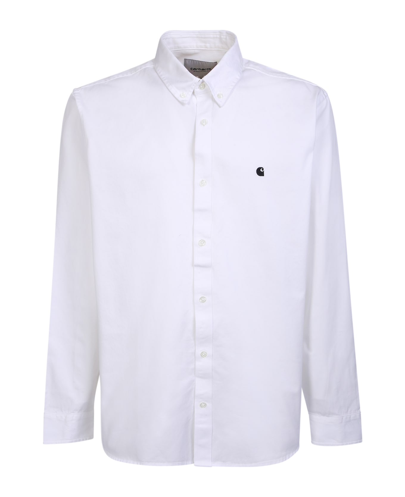 Button-down collar. Long sleeves. Front button fastening. Embroidered logo at the chest. Curved hem. Color: white