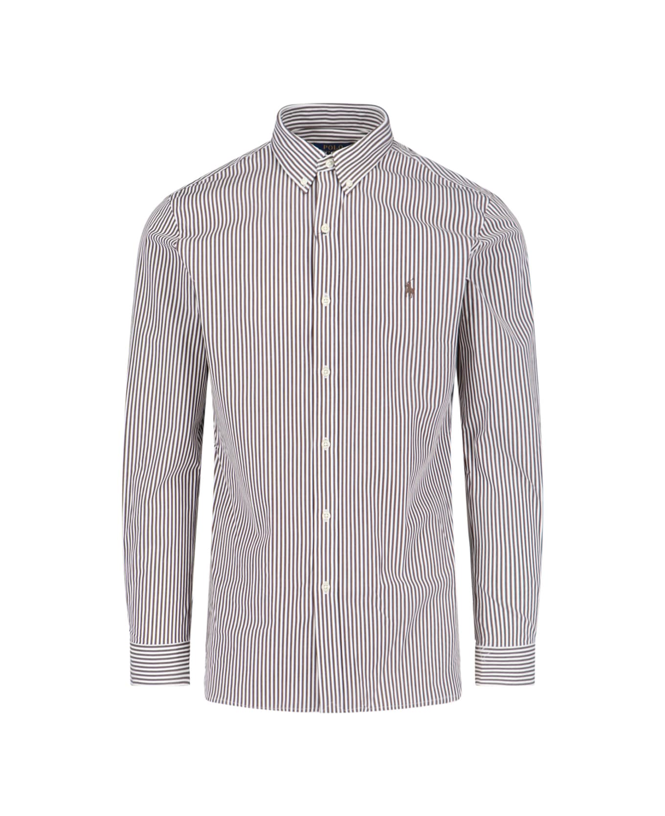 Polo Ralph Lauren logo shirt Oxford in brown stretch cotton with white stripe pattern, classic collar, button closure, button cuffs, brown logo embroidery on the front, two back pleats, curved hem.