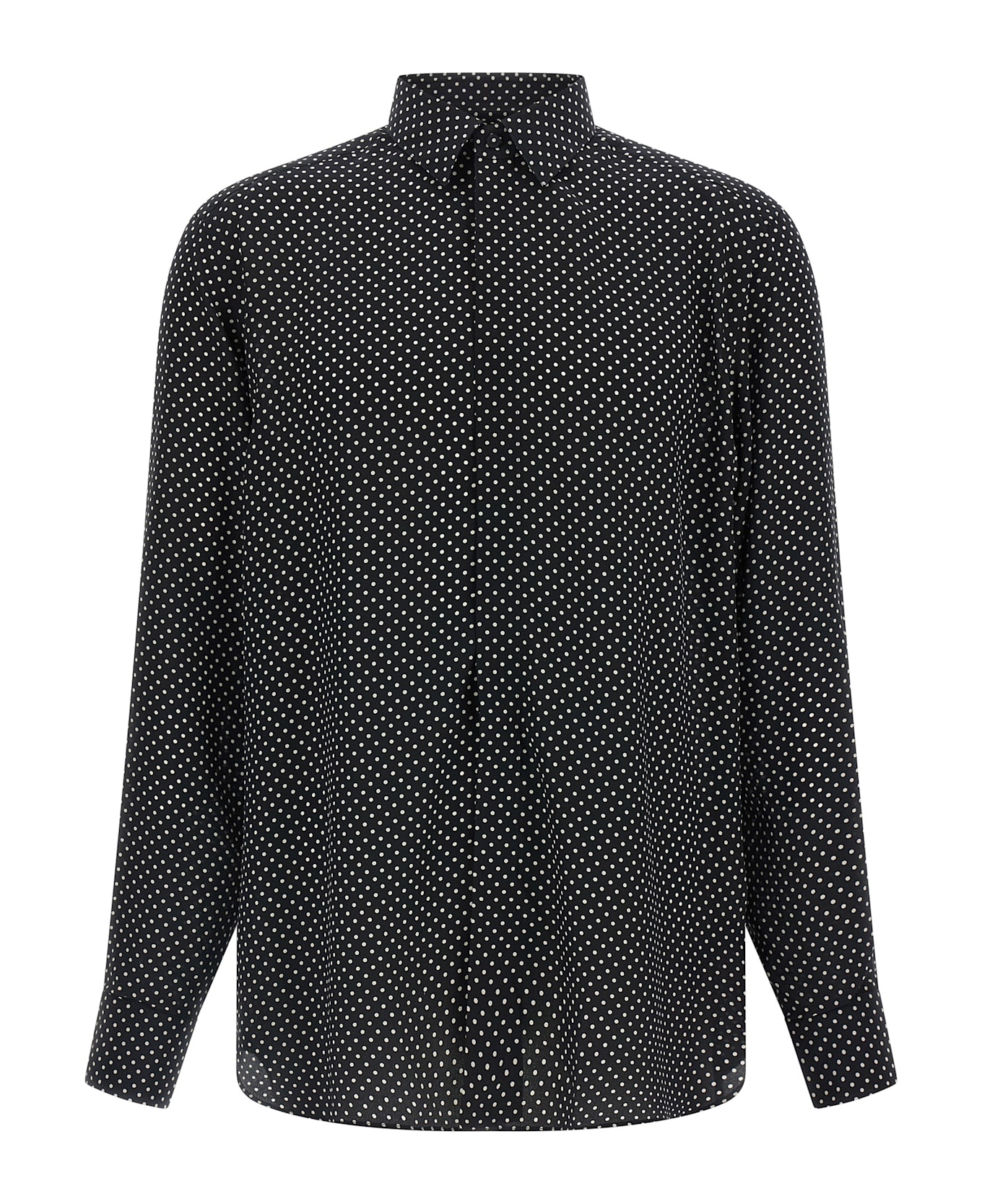 Polka dot crêpe de chine silk shirt, front button closure, long cuffed sleeves, rounded hem.