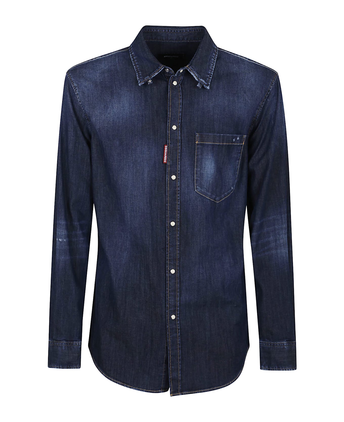 Stretch cotton denim shirt by DSQUARED2. Front button closure with exposed buttons, also present on the cuffs; patch pocket; classic collar; regular fit design. Features a red DSQUARED2 label.