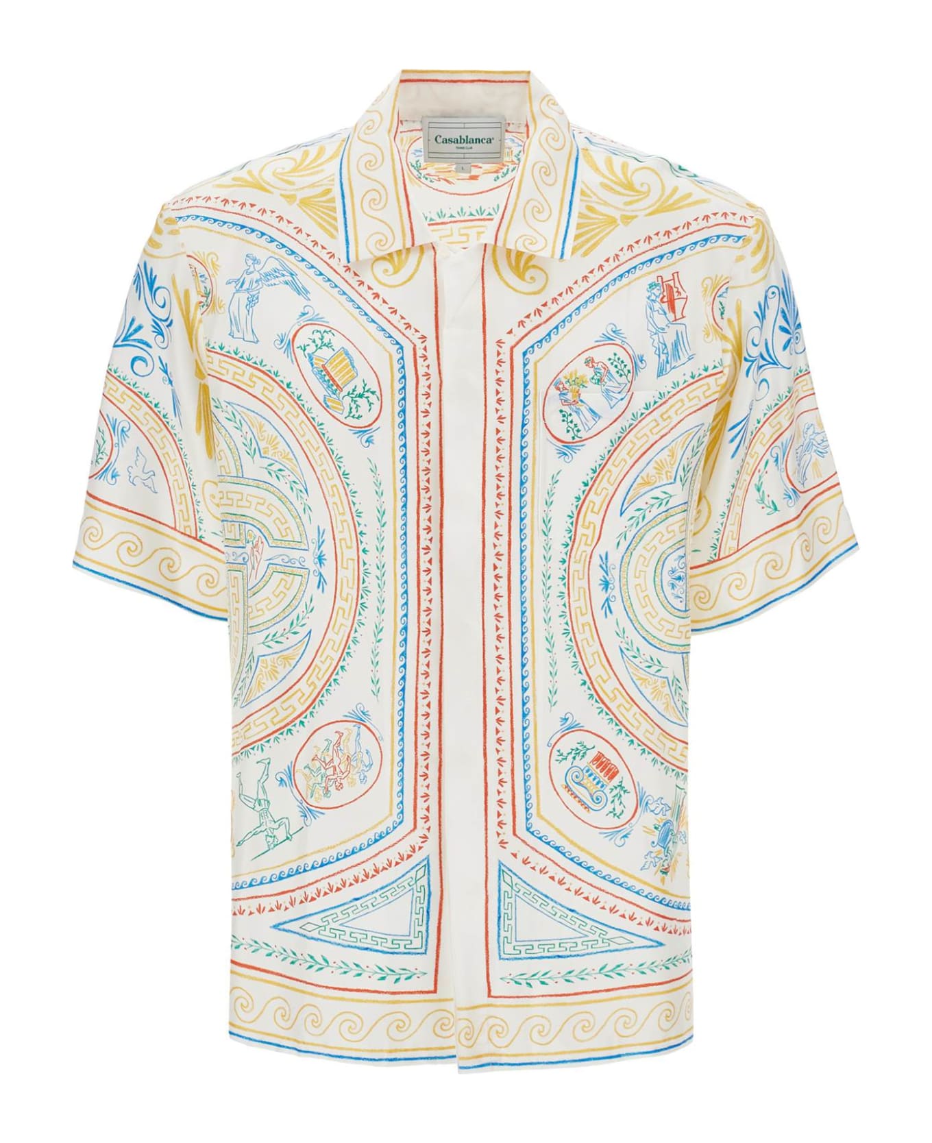 Casablanca's short-sleeved shirt is made of silk with a Crayon Vase print and features a Cuban collar. It has a front closure with hidden buttons and a relaxed fit. The model is 187 cm tall and wears size L. Composition: 100% SE