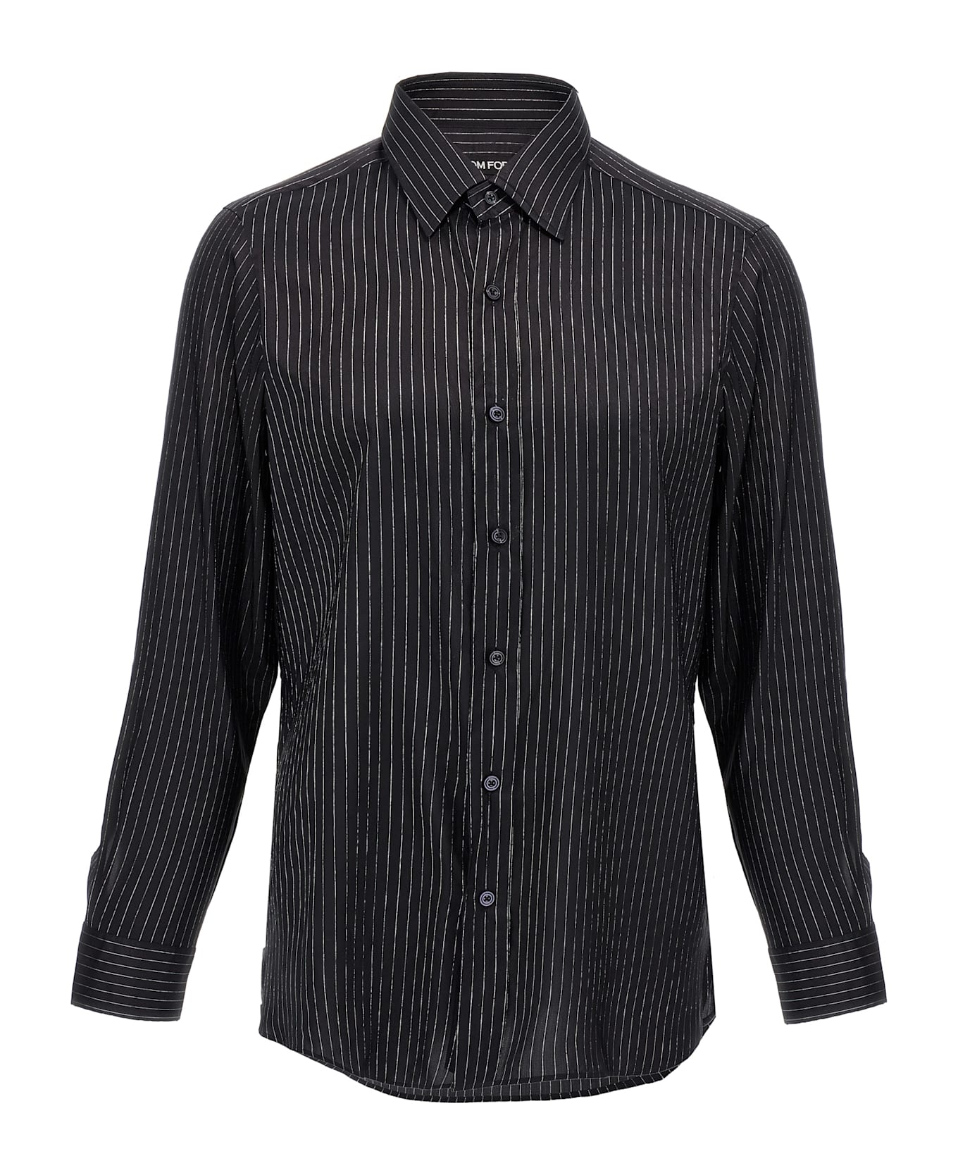 Silk shirt with metallic stripes, button closure, long cuffed sleeves.