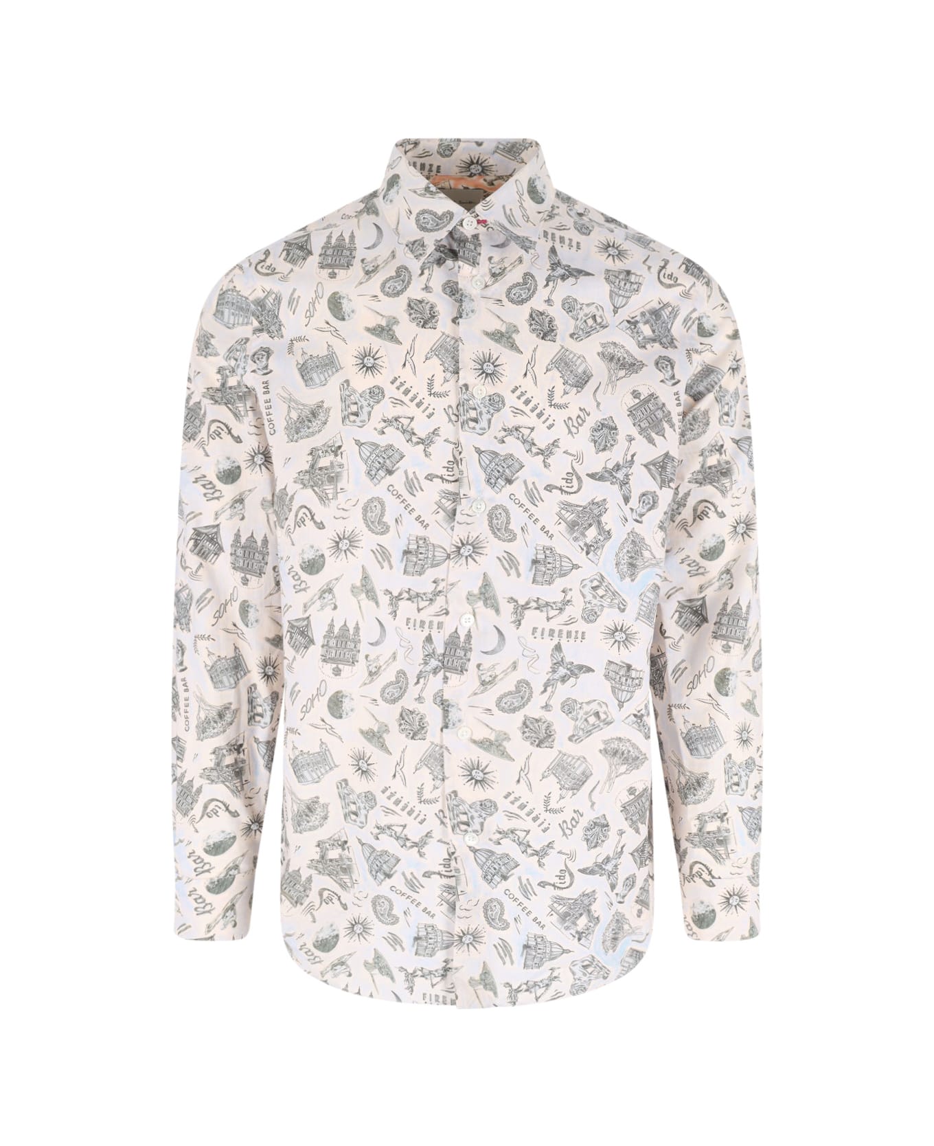 Paul Smith 'Souvenir' cream cotton shirt with blue print pattern, classic collar, button closure, button cuffs, curved hem.