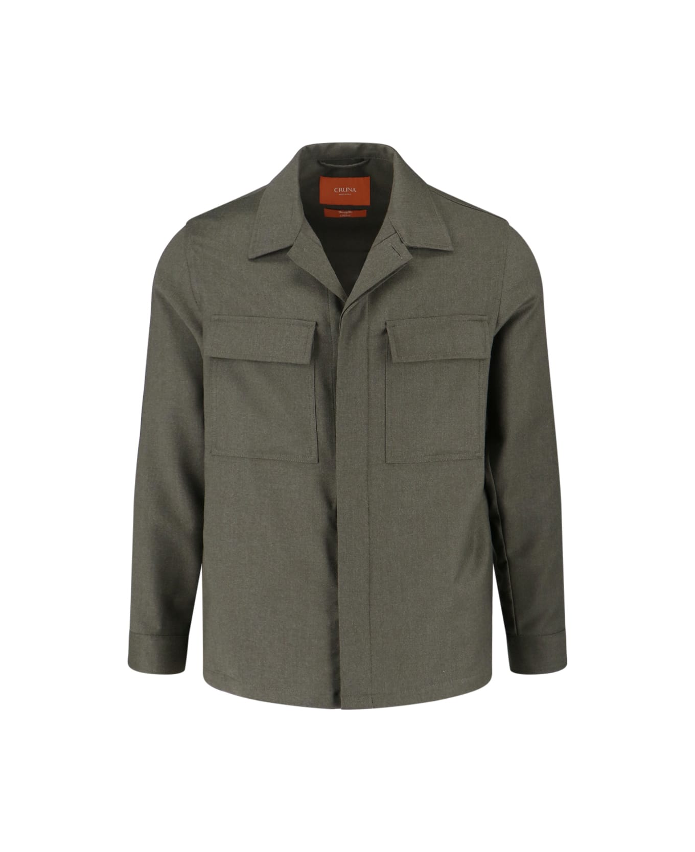 Cruna green virgin wool shirt with classic collar, button closure, two chest pockets, button cuffs, straight hem.