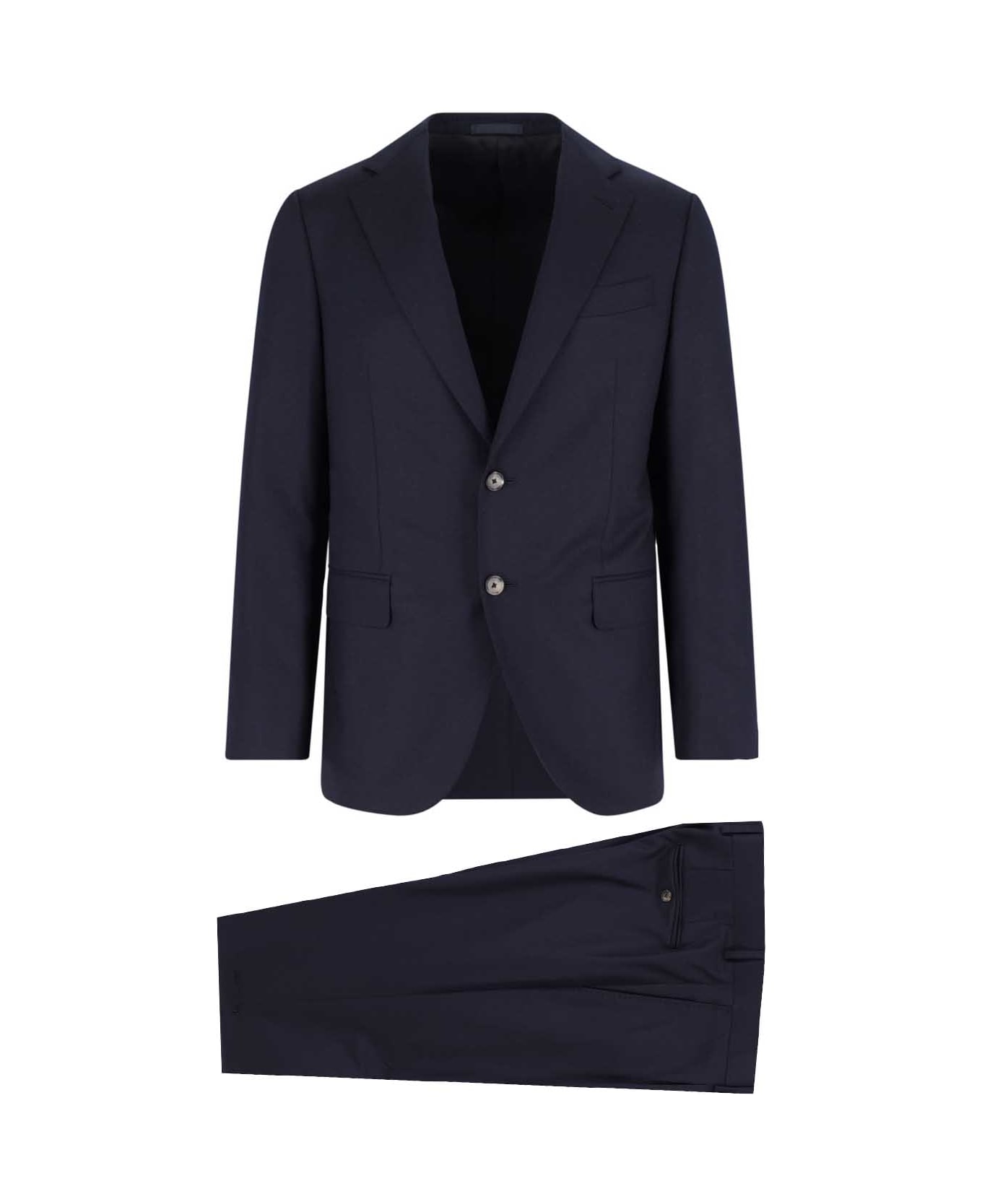 Caruso wool single-breasted suit in navy blue, classic lapels, two-button closure, chest pocket, two side flap pockets, buttons on the cuffs, straight hem, straight pants, belt loops, hook and zip button closure, front pin tucks, two side pockets, two back button welt pockets, straight leg.