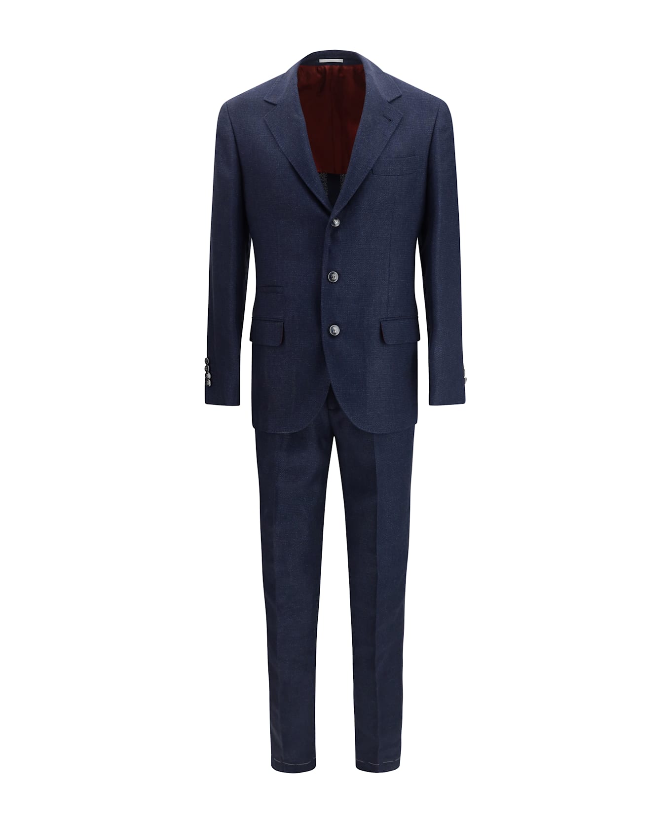 The two-piece single-breasted suit with wide peak lapels by brunello cucinelli embodies bold contemporary tailoring. the jacket features front button fastening, long sleeves with buttoned cuffs, partial lining, a chest welt pocket and front flap pockets enhancing its classic structure. the trousers are designed with belt loops and button fastening, side cargo-style pockets and two back welt pockets, combining functionality with refined elegance.
