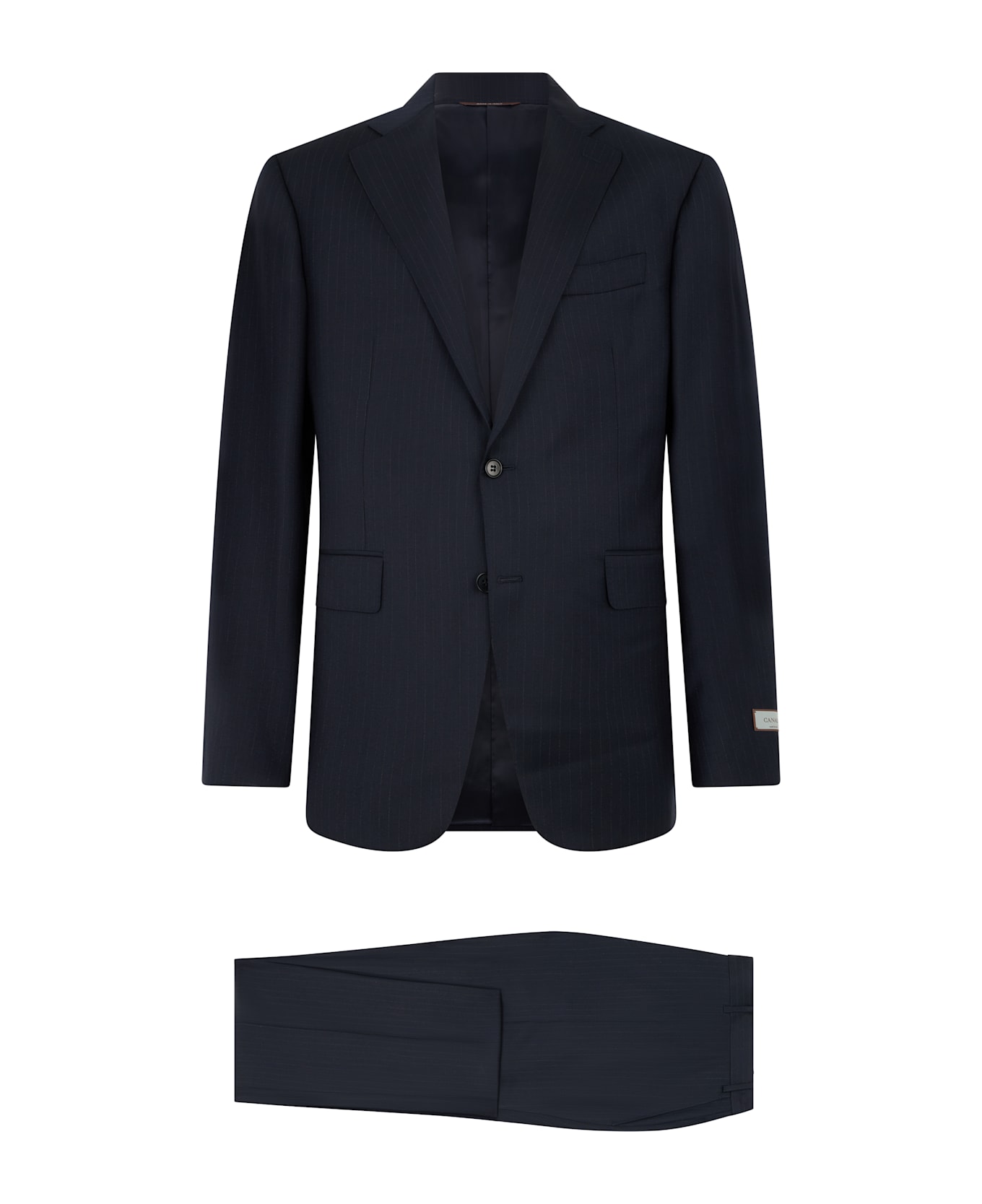 Single-breasted two-button jacket pin-striped motif lapel collar two front flap pockets and chest pocket trousers: side pockets belt loops 100% wool Composition: 100% % Wool