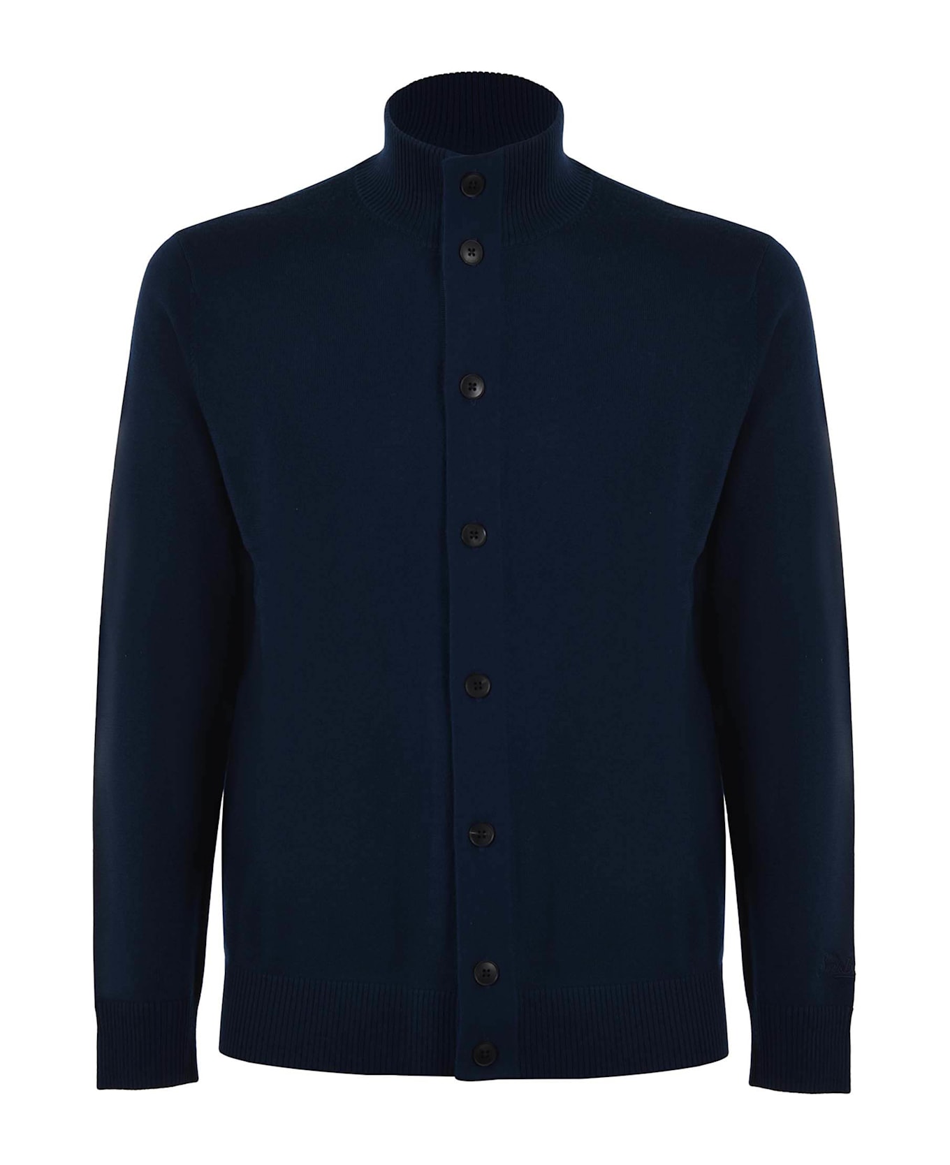Mc2 Saint Barth merino Wool Cardigan Dark blue. High neck. Long sleeve. Button closure. Ribbed cuffs and bottom. Tone-on-tone logo embroidery on the bottom of the left sleeve. Size in photo M 100% wool Composition: 100% Wool