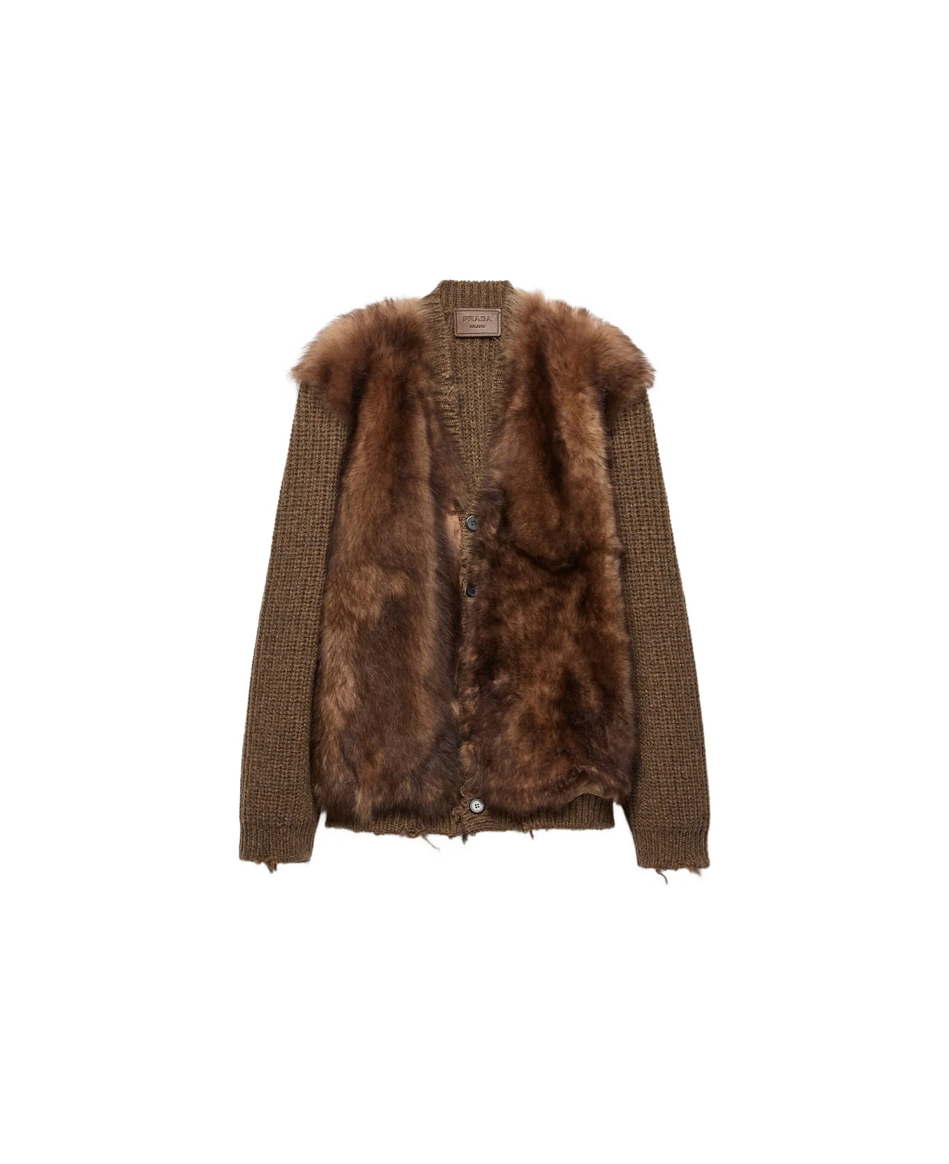 brown shearling trim ribbed knit centre button closure straight sleeves knit triangle logo