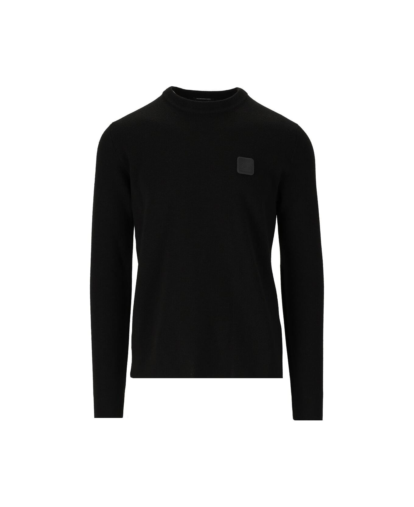 Jumper by C. P. Company made of black wool blend with logo patch on the front, removable with velcro. Ribbed collar.
