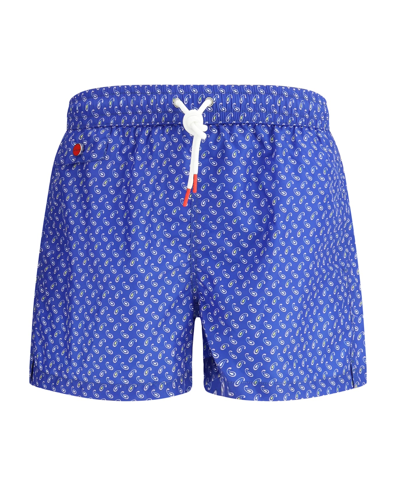 Kiton's swimshort is a refined and practical garment designed for those seeking elegance even on casual occasions. the adjustable elastic waistband with drawstring ensures a customized fit, while the side welt pockets are ideal for storing small items. the flap patch welt pocket on the back, decorated with the brand's iconic embroidered monogram, adds a distinctive and luxurious detail. the flap patch pocket on the front completes the practical and stylish design. the contrasting all-over repeated drop effect pattern gives the swimsuit a dynamic and modern look, combining comfort and sophistication.