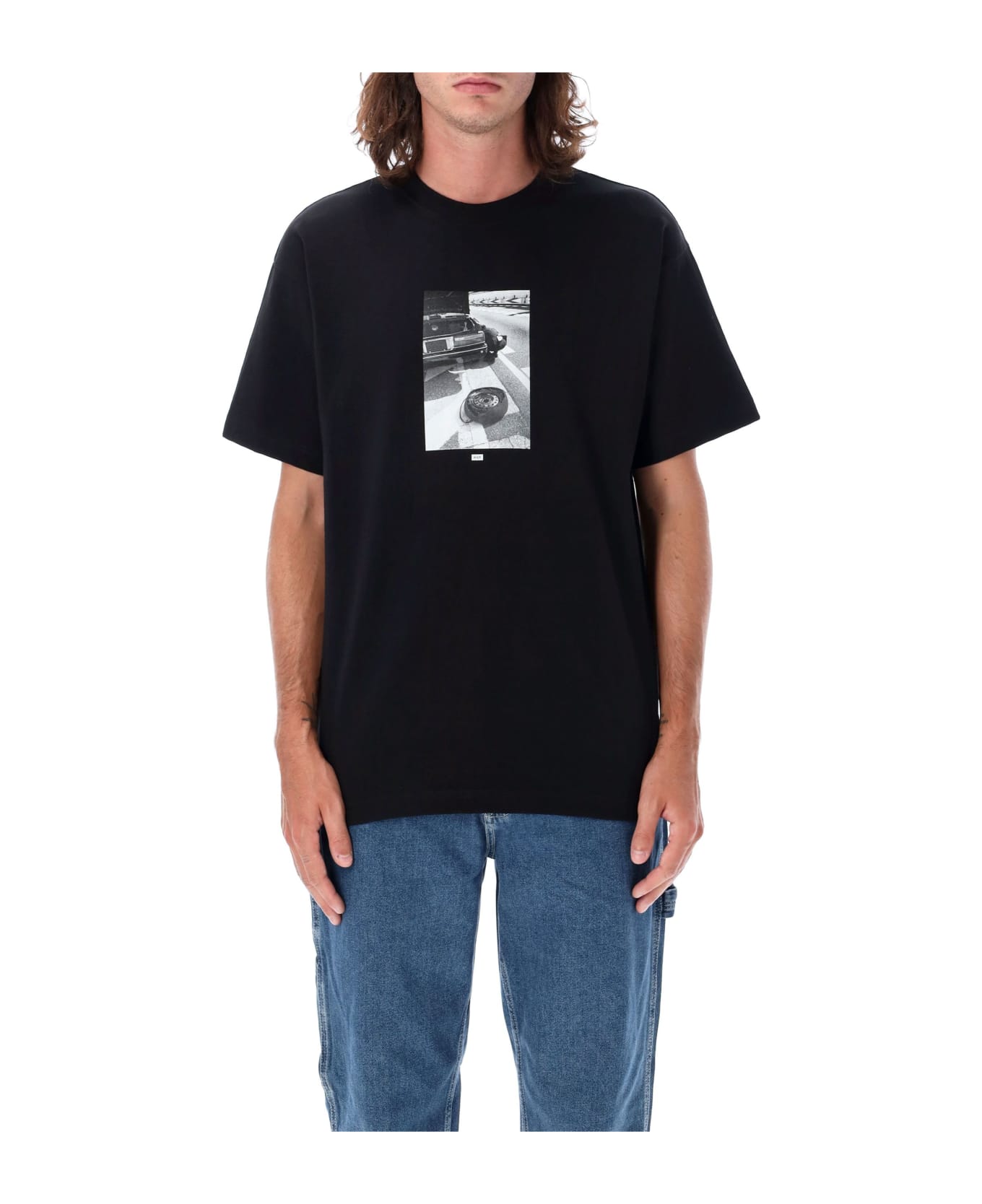 Car T-shirt By Huf. Featuring: Relaxed Fit Cotton Fabric Ribbed Crew Neck Short Sleeves Front Urban Scene Graphic Print Model Is 1,90m And Wears Size L.