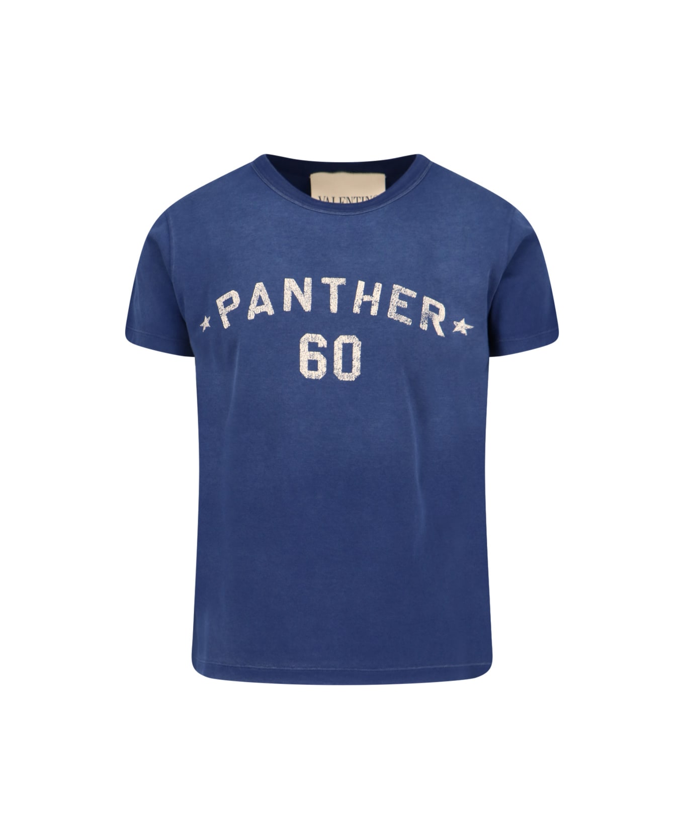 Valentino 'Chez' navy blue cotton T-shirt with crew neck, short sleeves, usured cream print on the front, maxi cream logo patch on the back, straight hem.