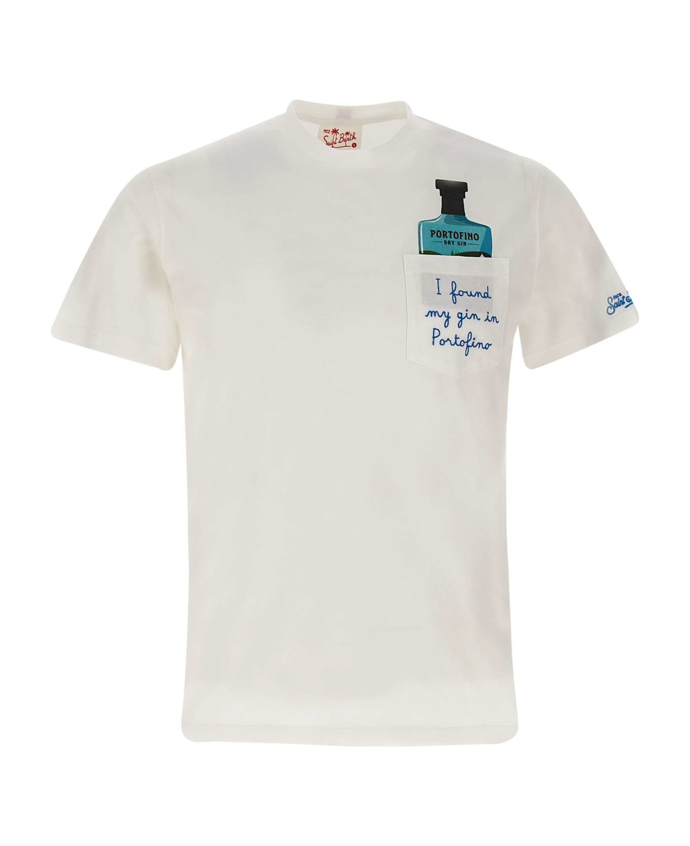 Mc2 Saint Barth "Dry Gin" men's cotton t-shirt, Portofino collection, white, short sleeves, crew neck, maxi multicolor front print, chest pocket, blue embroidered logo on left sleeve, regular fit. Composition: 100% Cotton
