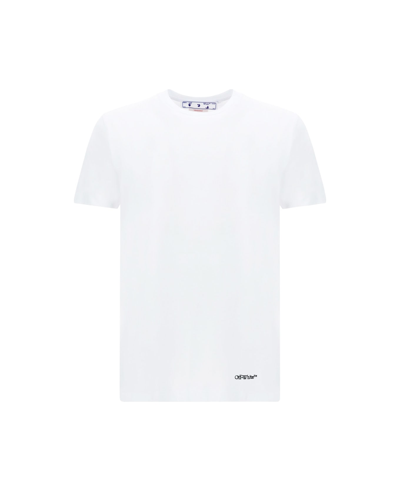 Cotton t-shirt from off-white featuring ribbed crew neck, contrasting graphic on back, iconic monogram print on front, tone-on-tone stitching, regular fit.