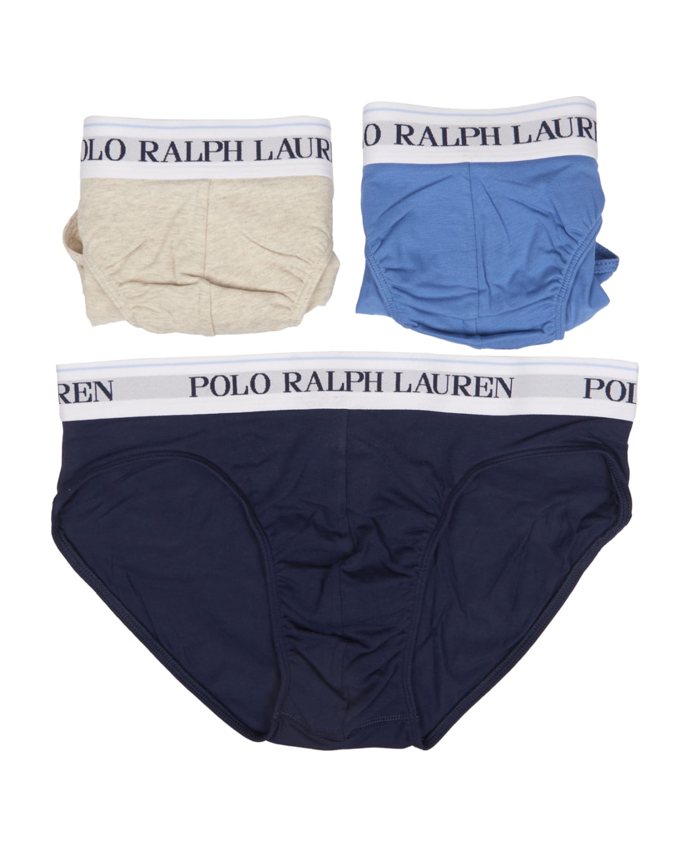 Trio of aviation blue, blue and beige melange briefs with logoed elastic waistband. Composition: 95% cotton, 5% elastane. Made in Cambodia.