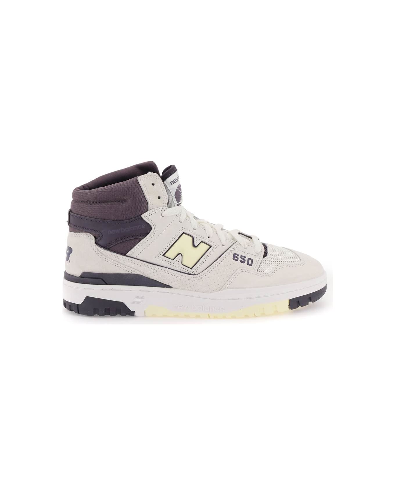 New Balance 650 basketball shoe-inspired sneakers featuring a suede upper with smooth leather and techno fabric inserts. Iconic contrasting embossed 'N' motif on both sides, printed logo on the heel and lettering logo printed on the sides. 650 print on front, logo tag on the tongue. Fabric lining with removable insole and rubber sole.