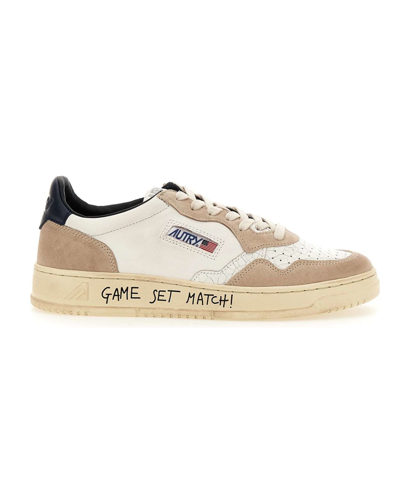 Autry "Aulm Wc08" men's leather and suede sneakers, white with blue heel tab and beige inserts, perforated toe for "cracked" effect transpiration, lace-up closure, fabric tongue with sponge padding, logo embroidered on front tongue and on side, padded collar, logo embossed on back, rubber sole with "Game Set Match! " 3. 5cm high.