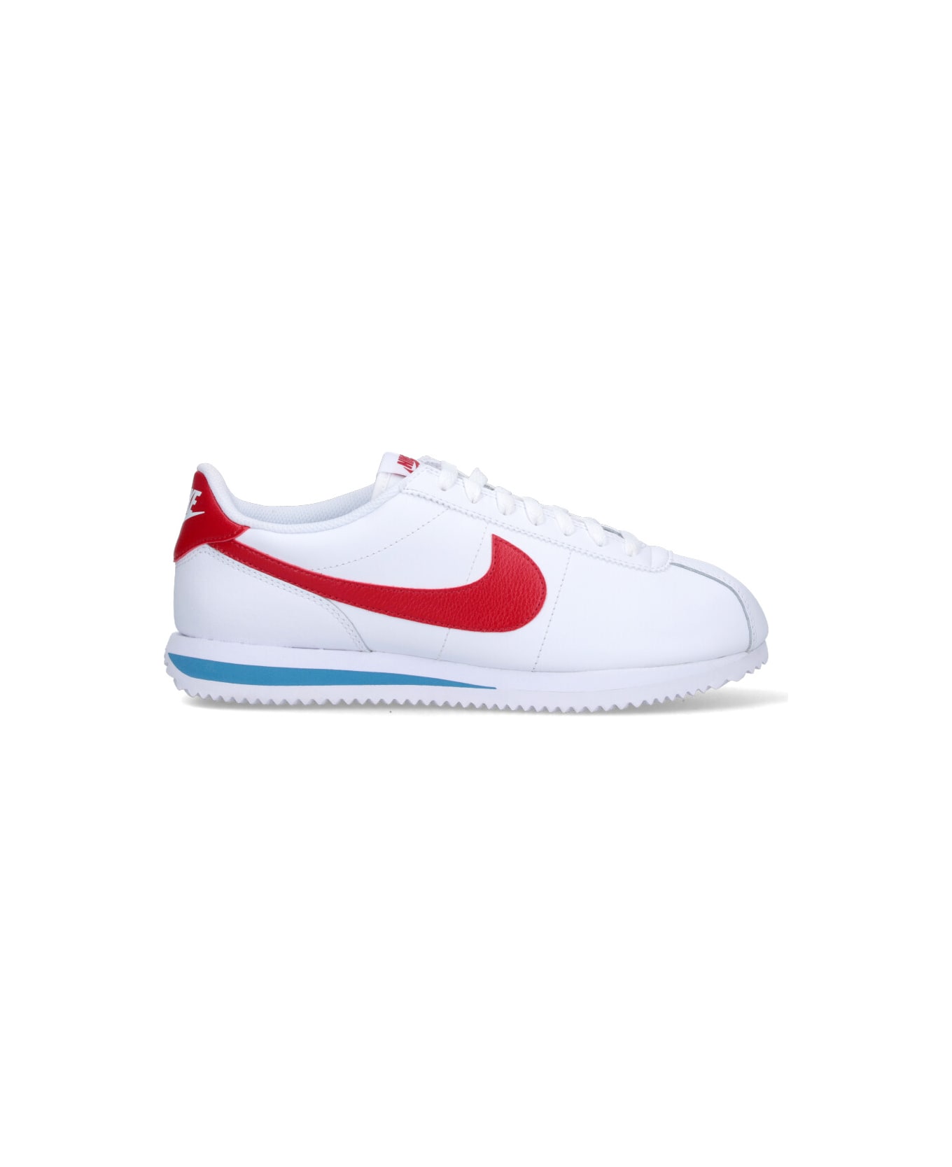 Nike "Cortez Leather" sneakers in white leather with round toe, laces, logo label on tongue, red hammered leather "Swoosh" logo on the side, red hammered leather back tab, white logo print detail, rubber sole, blue detail.