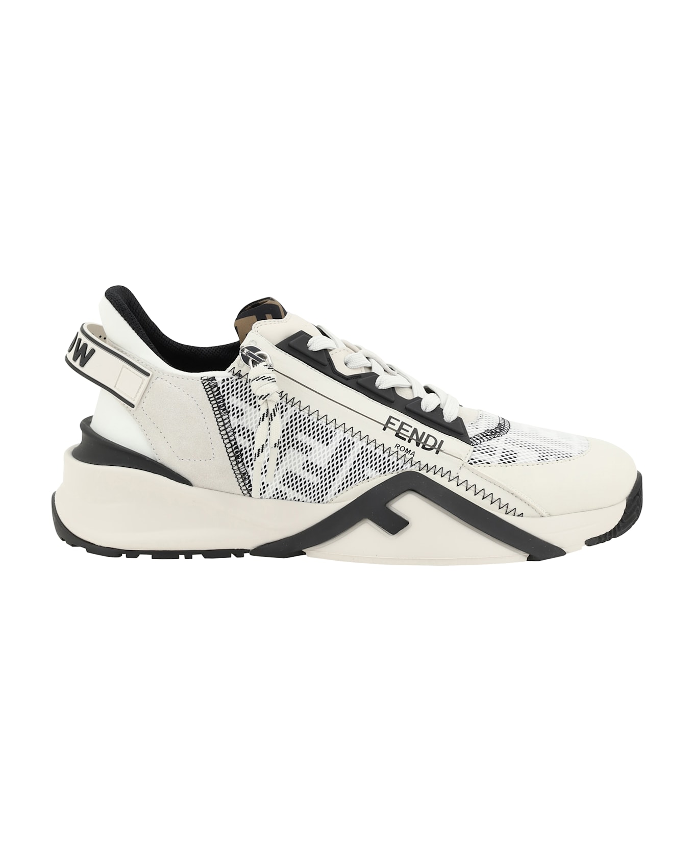 Fendi's flow leather sneakers are a bold and contemporary design that combines comfort and luxury. with a textured sole, these sneakers offer excellent grip and stability. the elongated toe gives a sleek look, while the side panels, decorated with the brand's embossed ff print, emphasize fendi's identity in an elegant way. the contrasting panel design creates a dynamic look, while the logo-embossed press-stud label on the tongue and the zipper appliqué on the back of the foot offer practicality and an additional stylistic detail. the front lace-up closure ensures a comfortable and secure fit, complementing the sophisticated design of these sneakers.