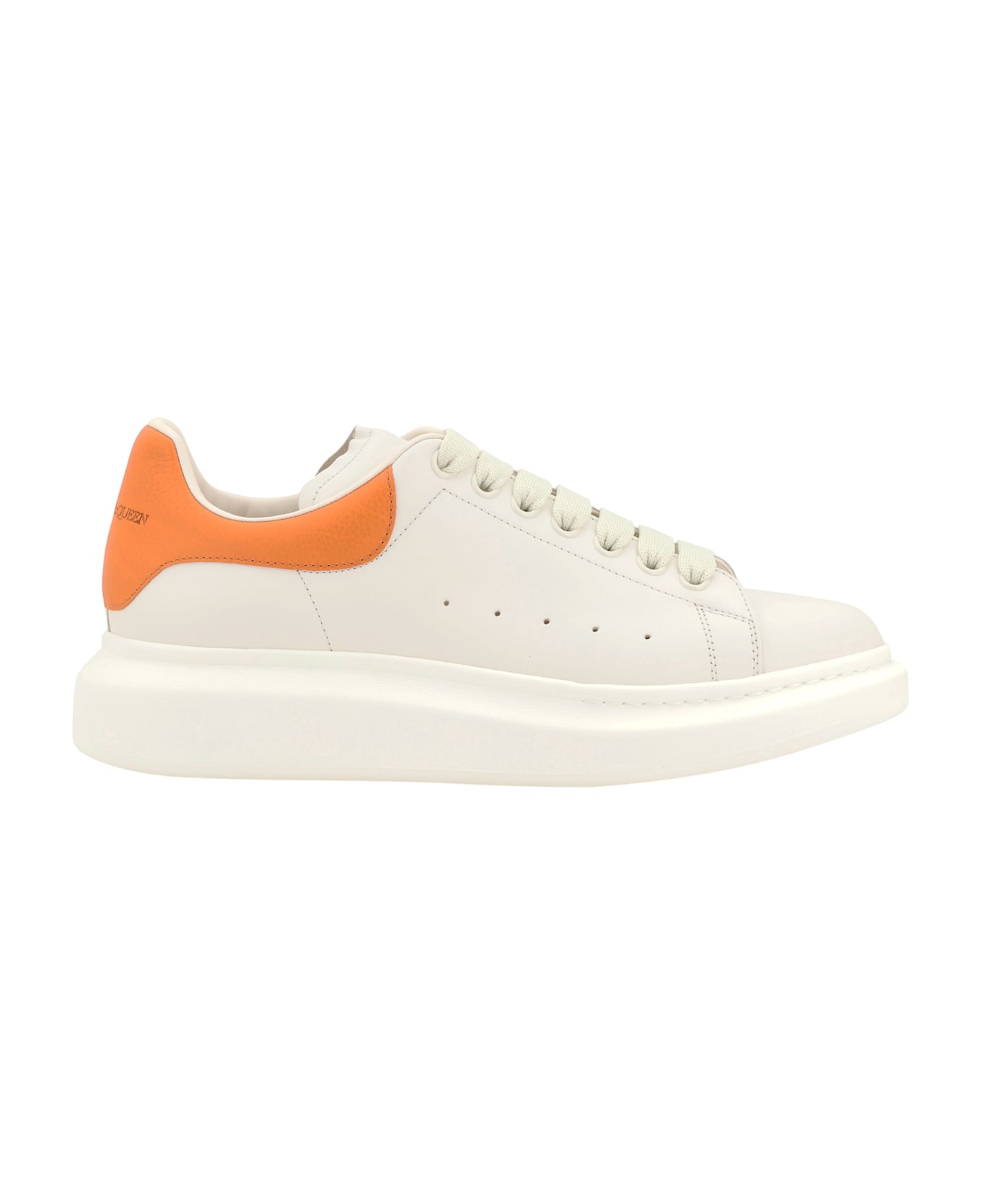 Alexander mcqueen's leather sneakers feature a lace-up front closure and a round toe for a classic, comfortable design. the front tab is press-studded logoed, while a logoed label on the heel adds a distinctive touch. the brand's iconic platform sole lends height and a bold, modern look.