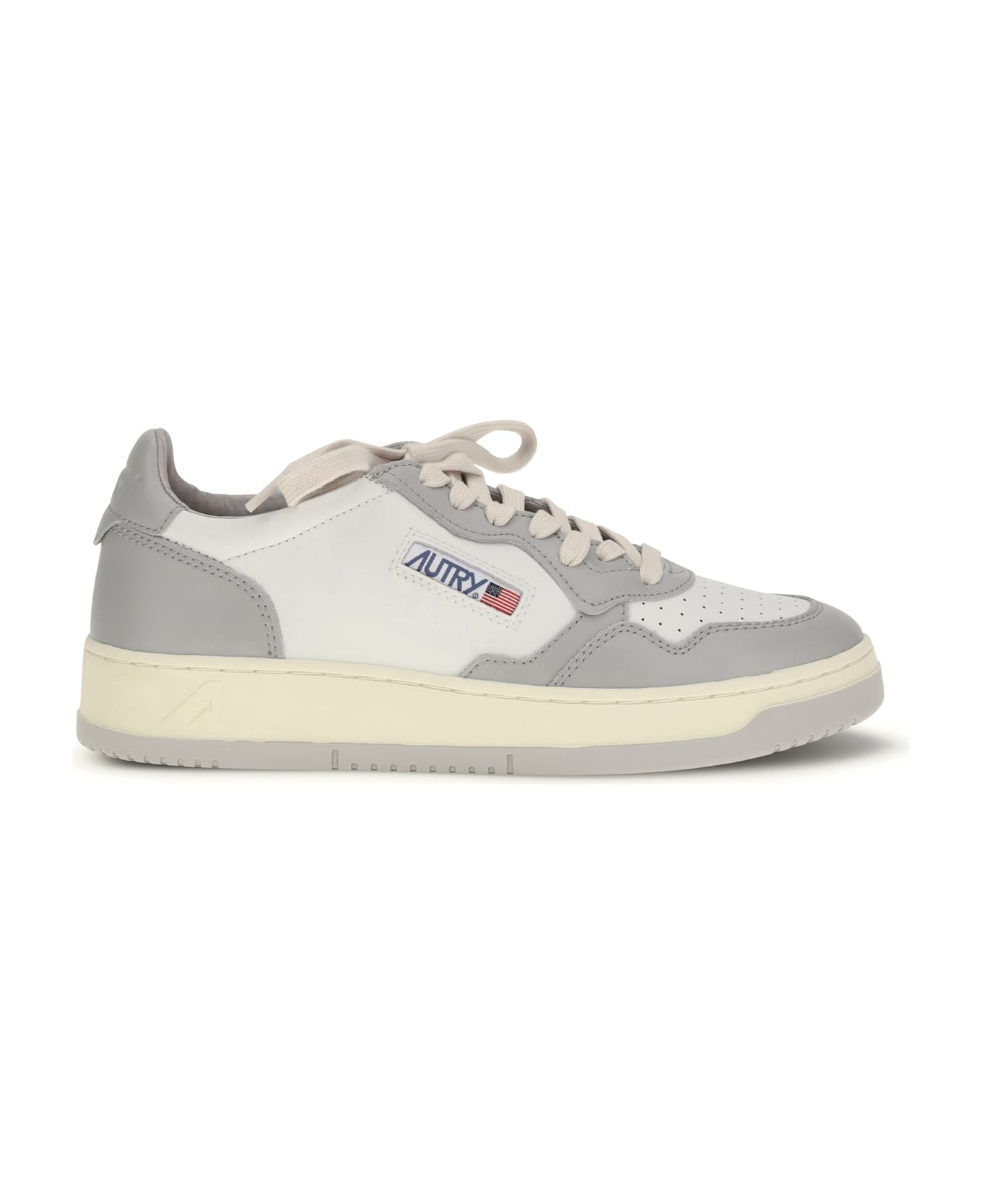 Calfskin medialist sneakers by autry, perforated round toe, lace-up front fastening, leather tongue with matching stitched label, contrasting iconic brand monogram on side panel, flat sole.
