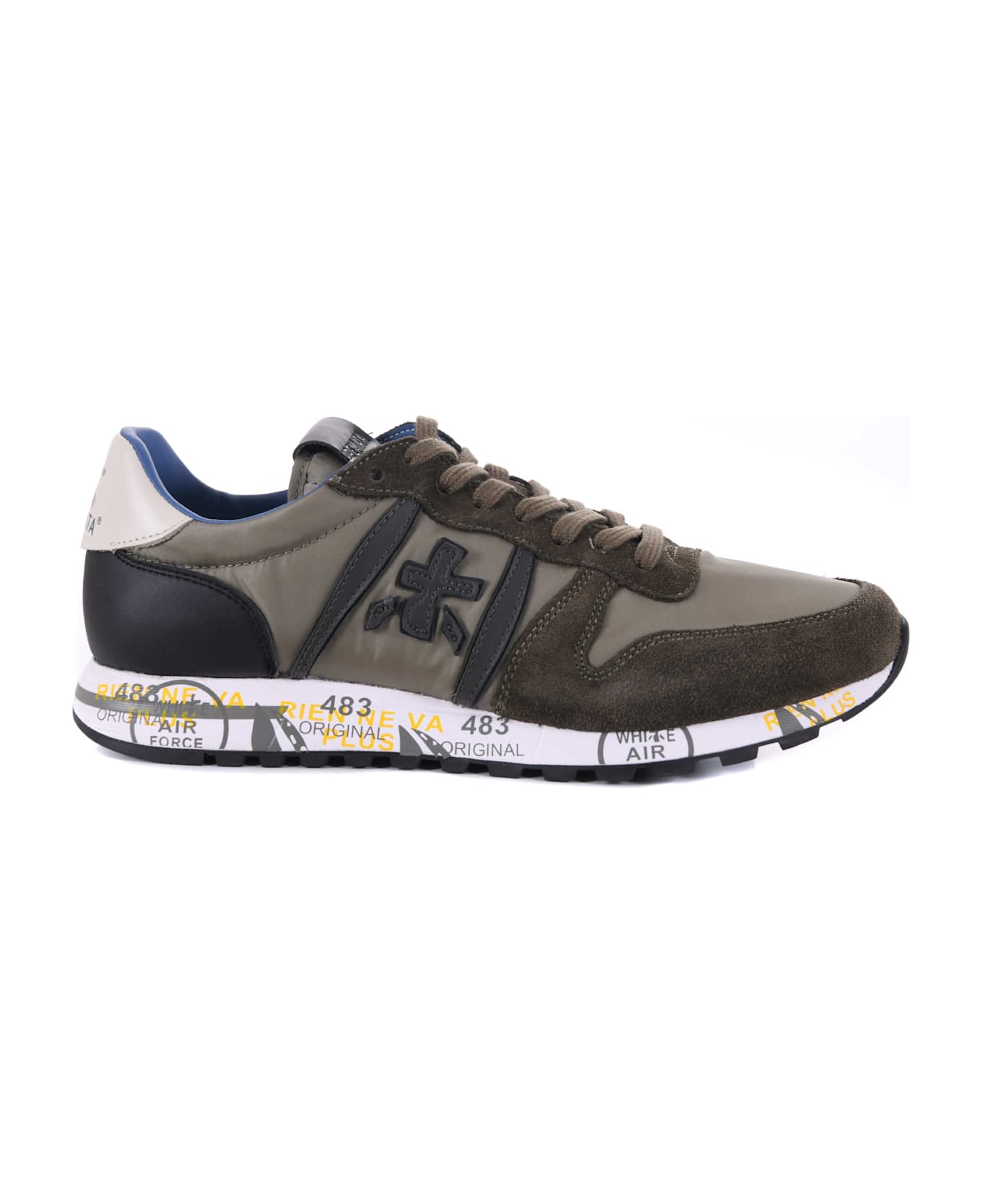 Premiata sneakers in moss green suede and nylon. Black and beige leather inserts. Side logo with irregular edges. Lace-ups. Logo patch on the tongue. 40 mm printed rubber sole. Size in photo 40