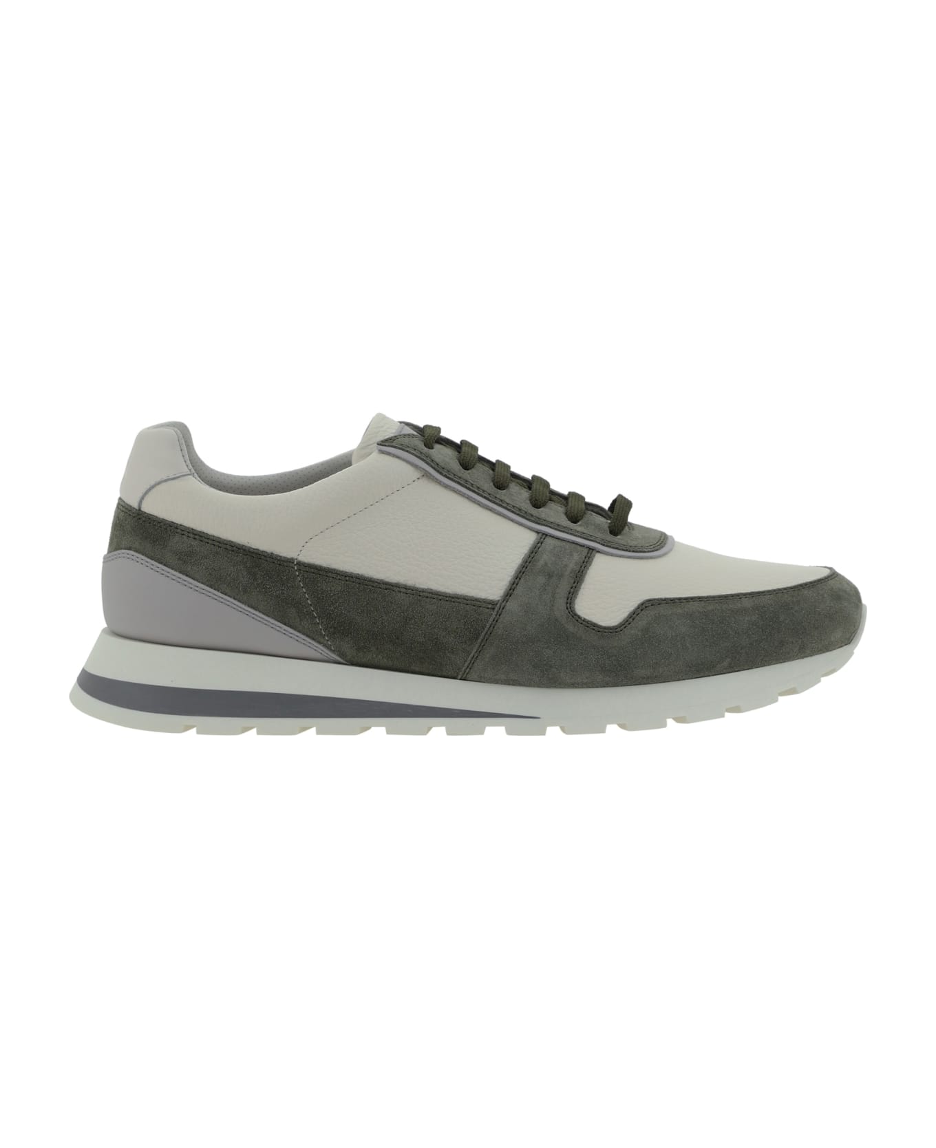 Leather sneakers by brunello cucinelli featuring a slight pointed toe, a lace-up front fastening, a contrasting branded signature print heel pull, a branded insole, a panelled design with suede detailing.