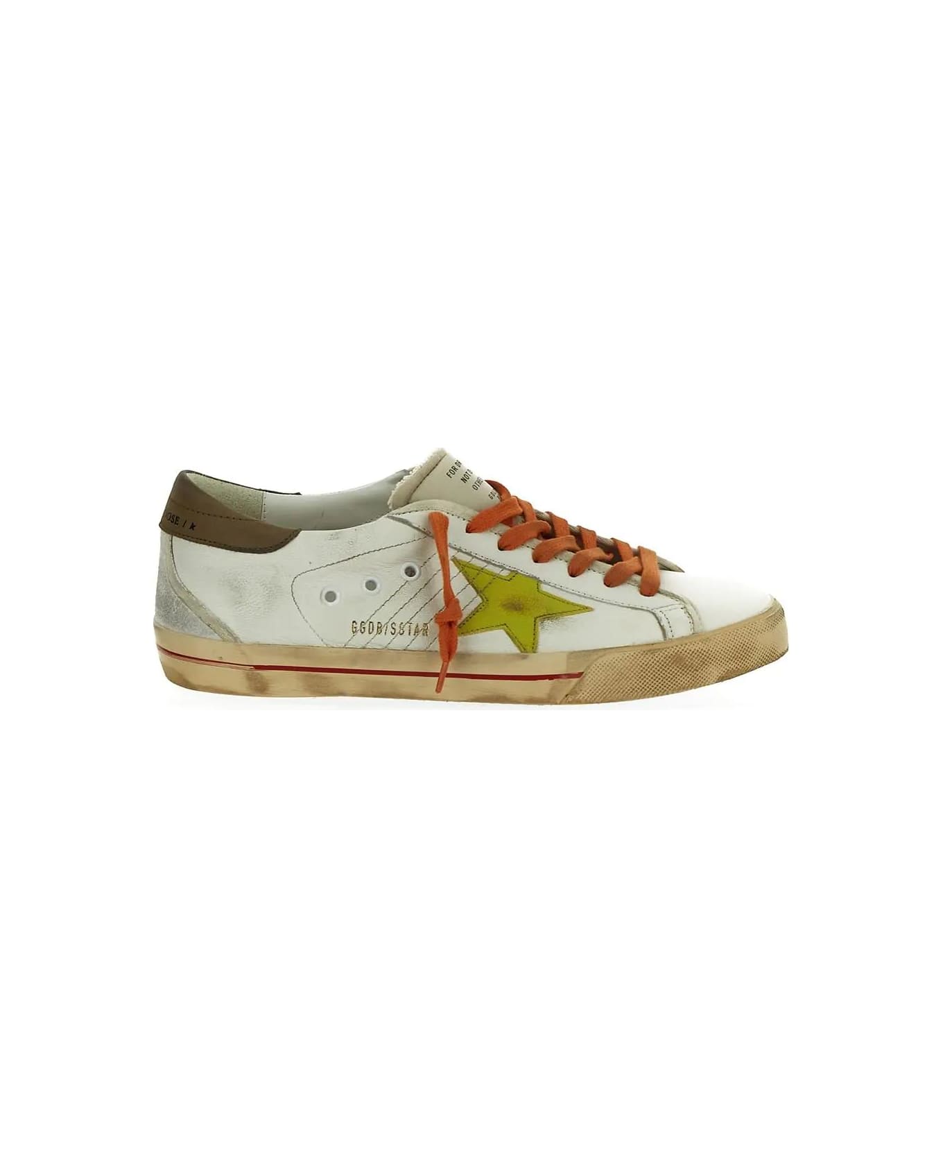 Golden Goose lace-up sneaker in white grained leather with grey suede leather detail, brown suede leather heel with black logo print, star patched on one side in Citronelle grained leather, ruined details, round toe, stitching details, golden logo printed on one side, rubber sole and blue under foot.