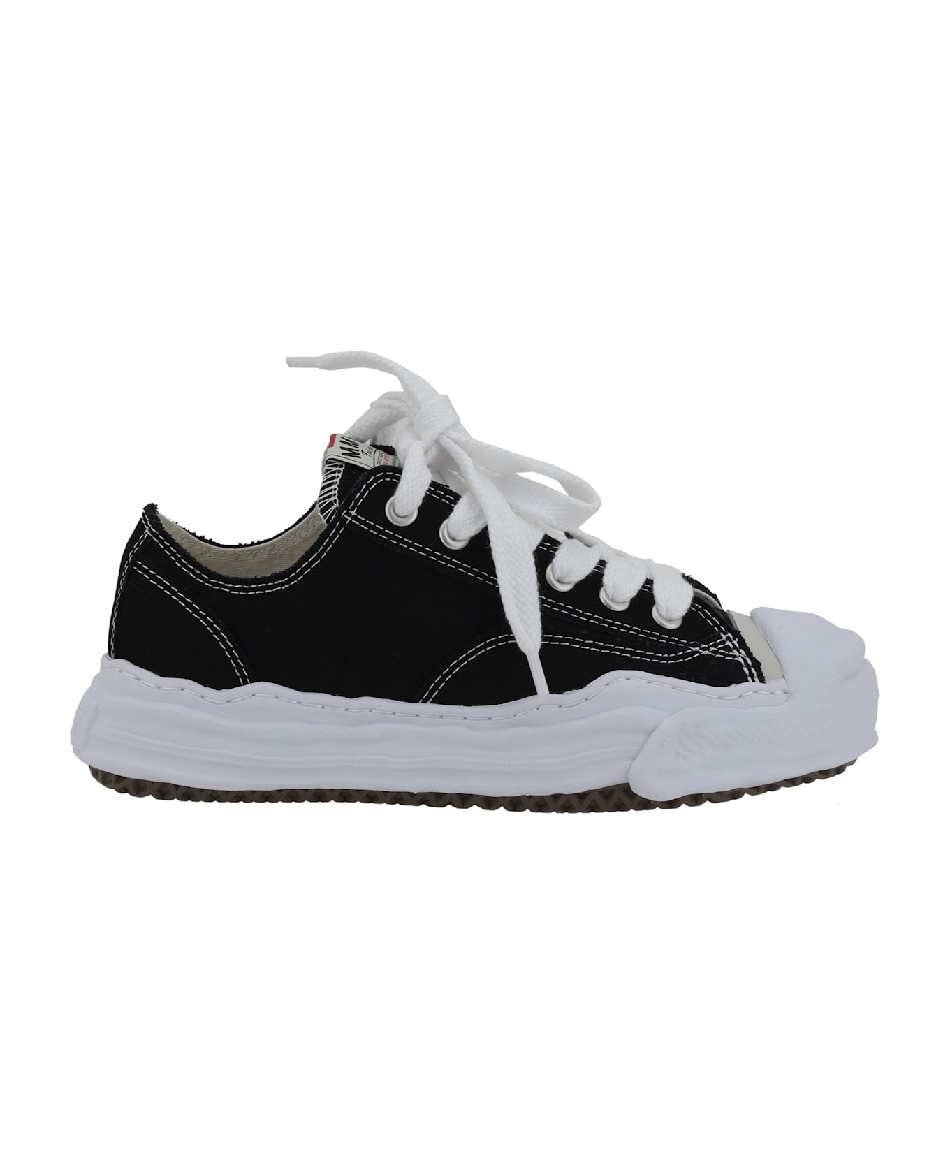 Maison mihara's hank og sneakers feature a white canvas upper embellished with contrast stitching that accentuates the minimalist design. the lace-up closure and logo patch tongue add a distinctive touch, while the white rubber sole completes the sleek and versatile aesthetic. a great choice for those seeking a casual yet sophisticated look.