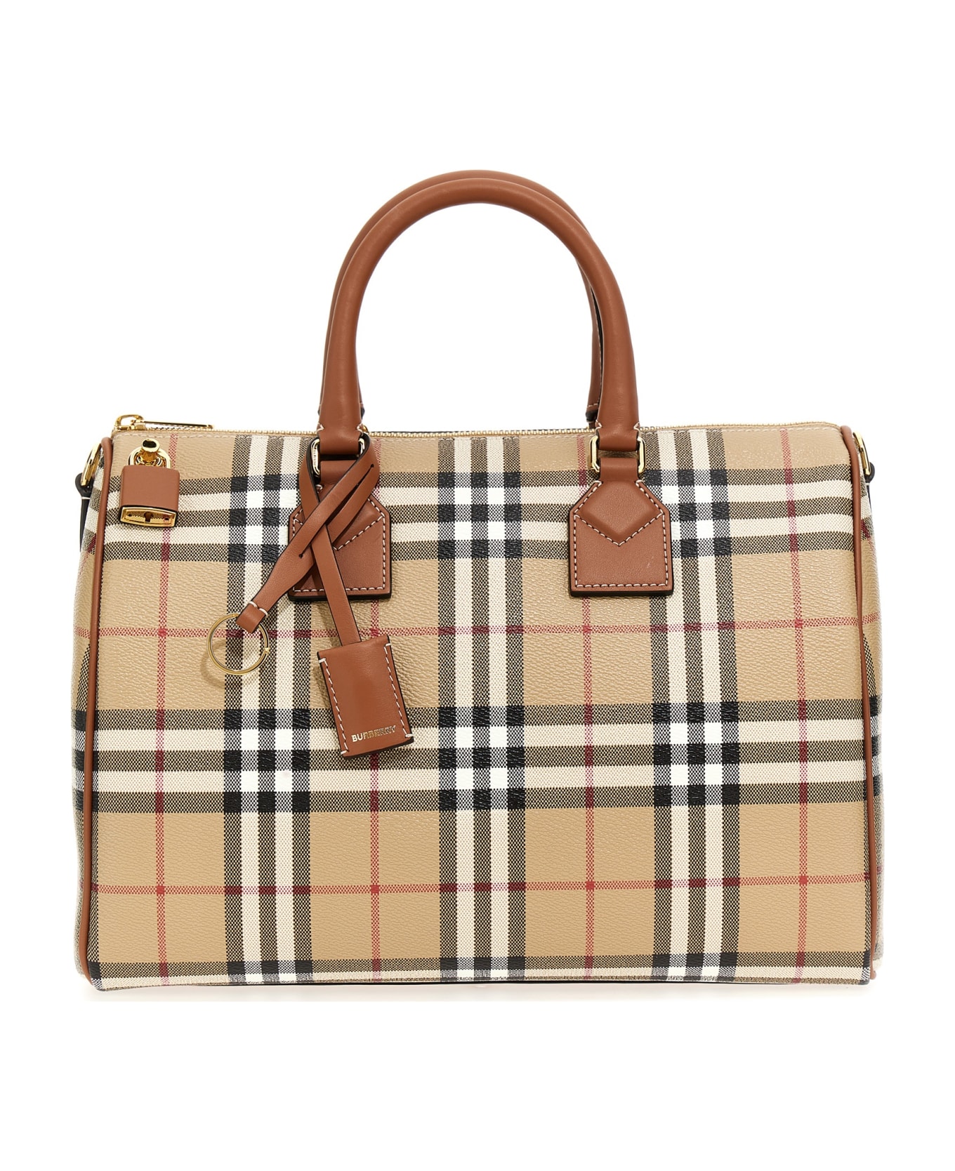 Burberry Check print 'Bowling' duffel bag with leather details, double leather handle, zip closure, metal padlock detail, removable tag, adjustable and removable shoulder strap. Composition: 54% polyurethane 35% cotton 11% polyester