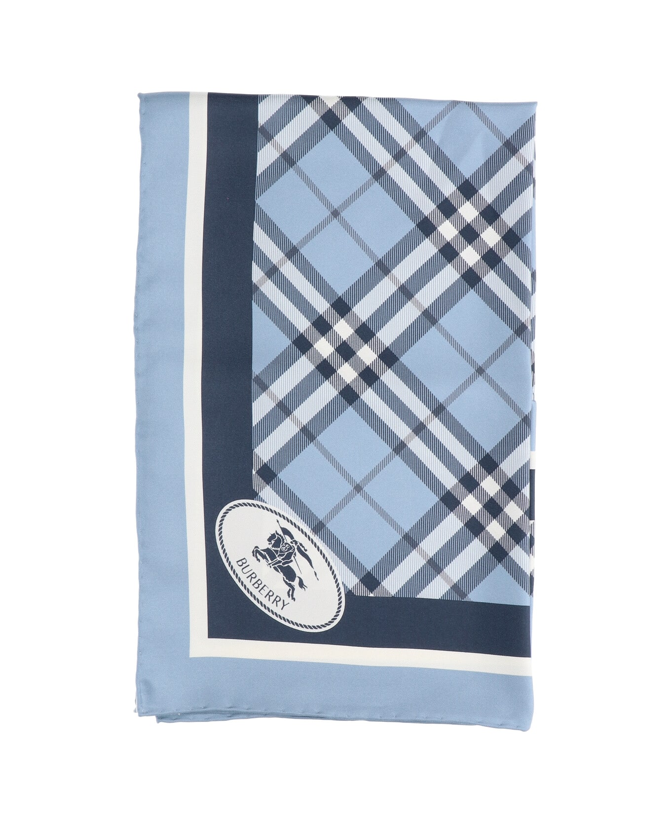Burberry 'Check' blue silk scarf with square design, all-over 'Check' pattern, 'Knight Stamp' detail Composition: 100% Mulberry Silk