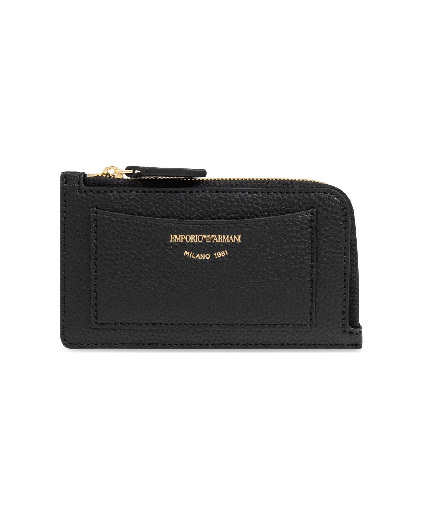 Presenting the Emporio Armani Card Holder , an epitome of sophistication and functional elegance from our exclusive collection. Crafted in a sleek, rectangular silhouette with a rounded corner, this black card holder is a testament to refined artistry. The exterior features a luxurious grainy texture, meticulously crafted from high-quality black leather, ensuring both durability and a timeless, refined look. The front is adorned with a prominent gold inscription, EMPORIO ARMANI MILANO 1981 , underscoring the brands prestigious heritage. Designed with practicality in mind, the card holder boasts multiple card slots on the reverse side, enhancing its utility. The gold zip closure at the top, accented with a black leather pull, secures a spacious main compartment, perfect for additional essentials. Why Choose This Product? Exquisite grainy leather for a luxurious touch. Distinctive gold logo and inscription for a prestigious appeal. Multiple card slots for enhanced functionality. Secure gold zip closure with an elegant leather pull. Emblematic of Emporio Armanis high-quality craftsmanship. Composition: 100% Fabric