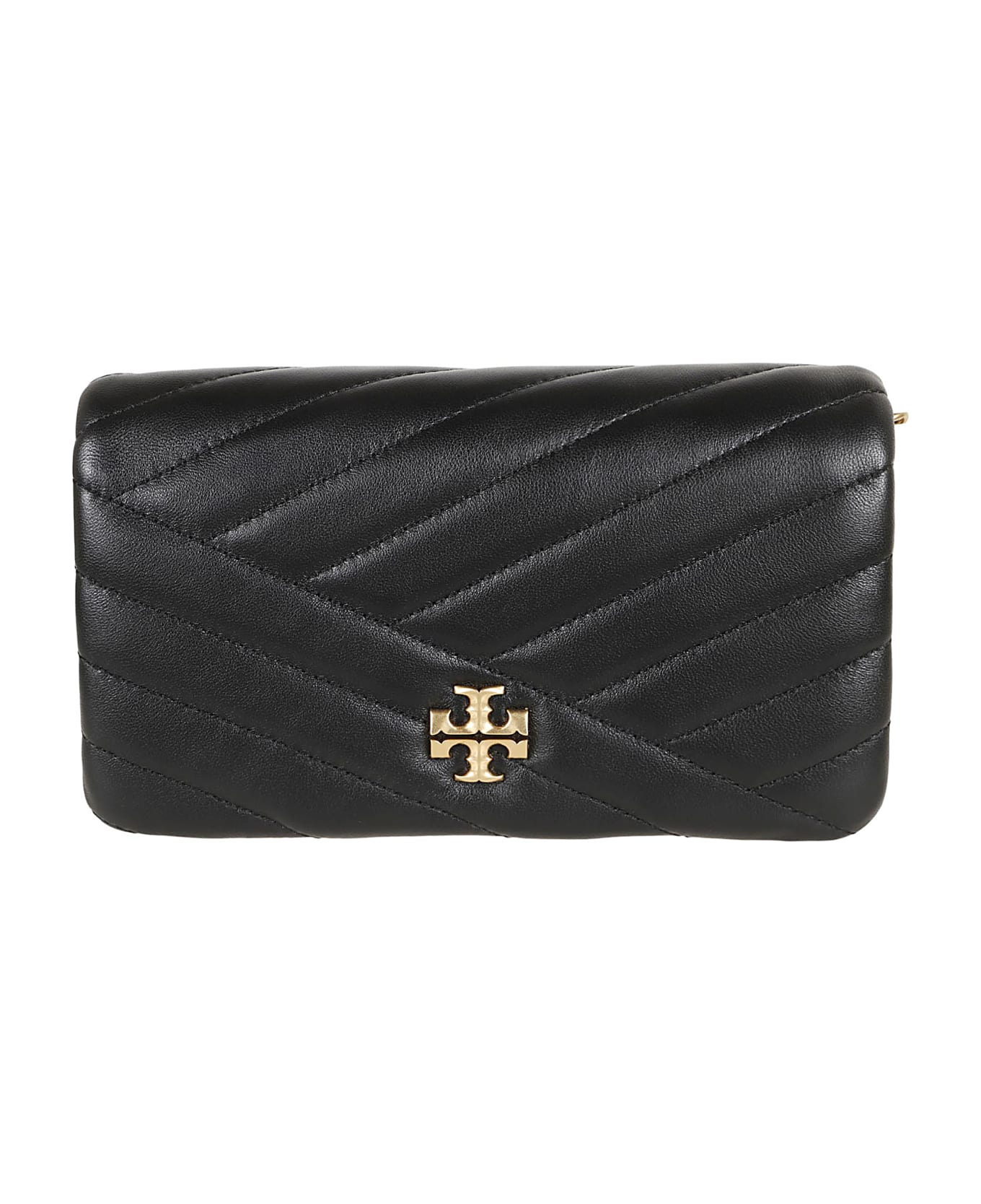 Kira Chevron Chain wallet in nappa leather BY TORY BURCH. Flap with magnetic snap closure; one external rear slip pocket, one internal zippered pocket and two internal card pockets. Quilted pattern leather, bevelled Double T detail as a graphic element on the wallet. Wear it across the body with the removable leather and chain shoulder strap or remove it to carry it as a clutch.